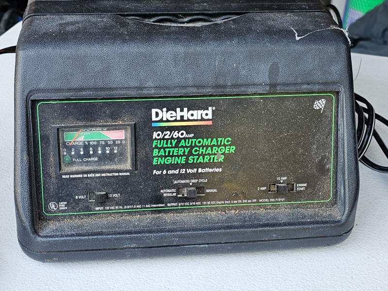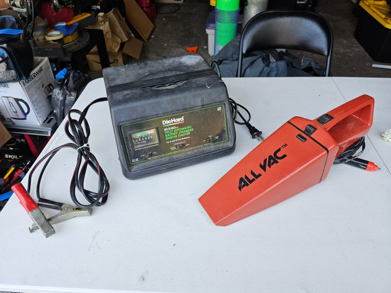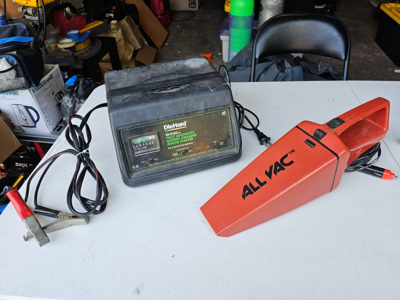 Diehard Automatic Battery Charger/Engine Starter & 12V ALL-VAC Car Vacuum Diehard 10/2/60amp fully automatic battery charger & engine starter Diehard #200.71301 Charges 6V and 12V at 2amp, 10amp, or engine start at 60amp setting Carry handle Has Auto, Deep Cycle & Manual settings Tested - Powers On! ALL-VAC 12V car Vacuum Plugs into cigarette lighter Easy pop-off dustbin Tested - Works!