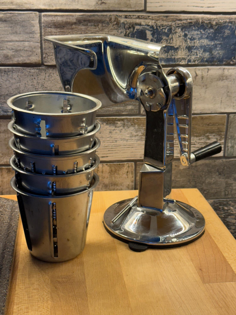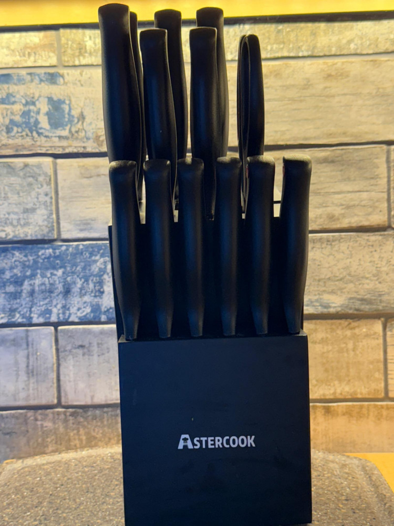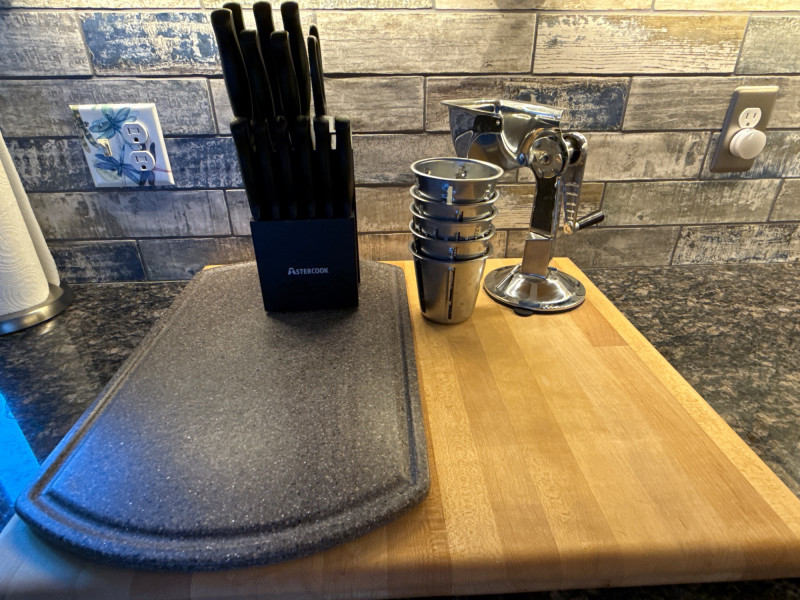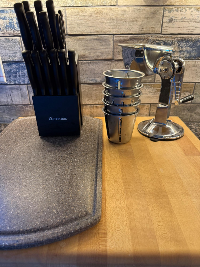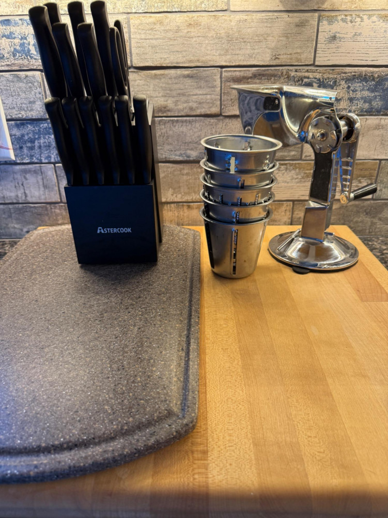 Butcher Block Cutting Board Appears Unused! 21”x24” Astercook 14 Piece Knife Block Hand Cutter System with suction cup base and 5 Cutting/Grating/Slicing Tubs