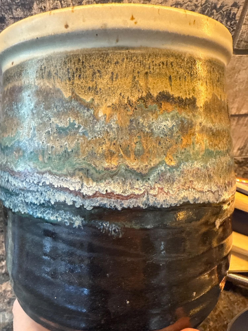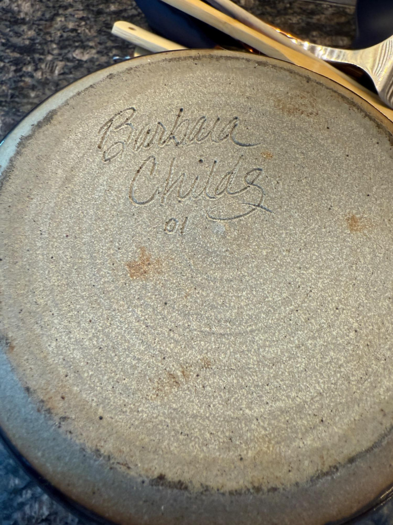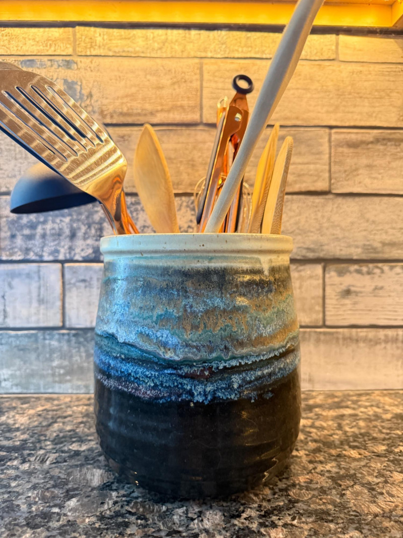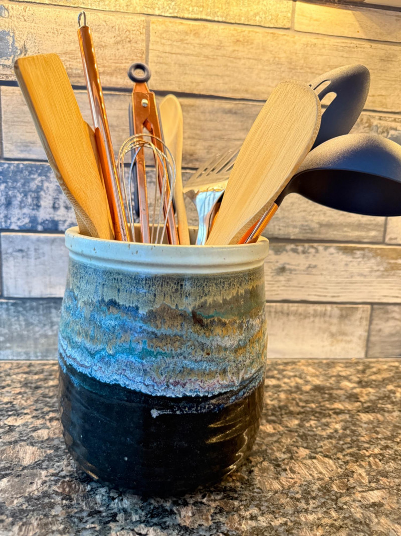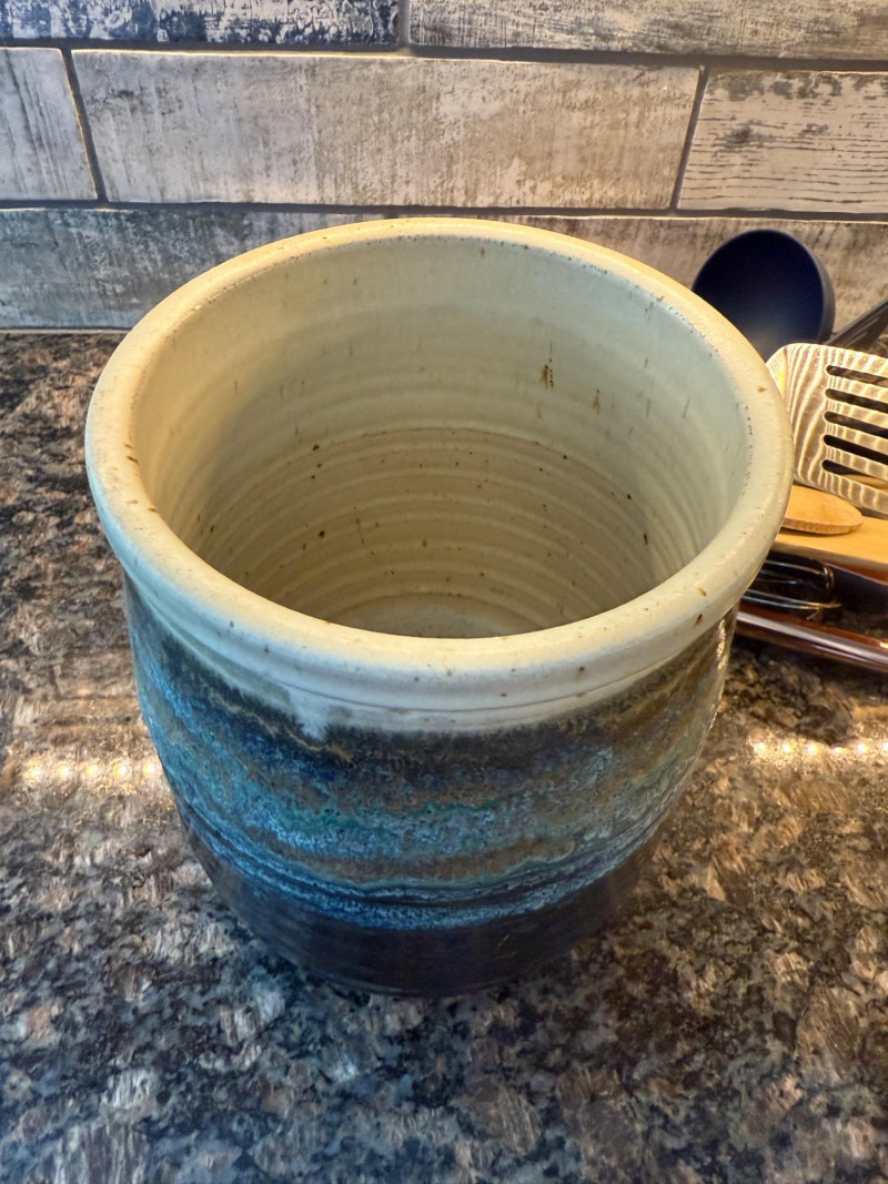 Handcrafted Glazed Pottery Crock hand made by Barbara Childs Crock measures 6”x7” Variety utensils