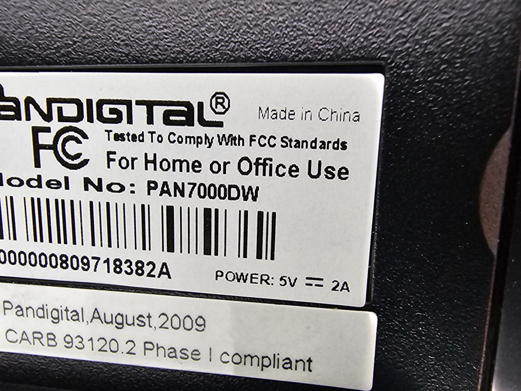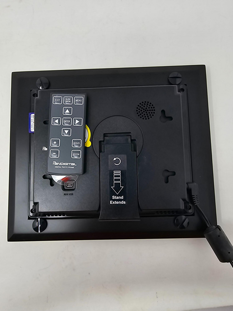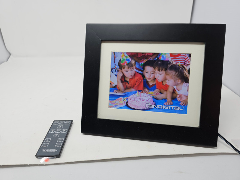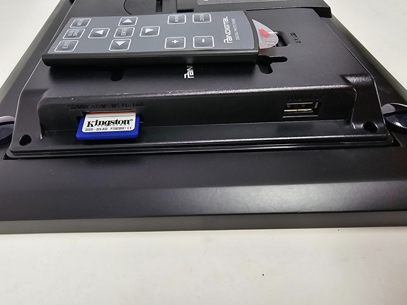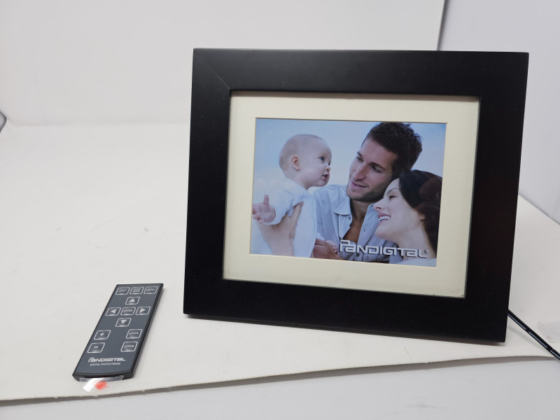 Pandigital 7-Inch Digital Picture Frame & Remote Pandigital Model #PAN7000DW 7.0" viewable LCD display - holds up to 6400 images, 4:3 Aspect Ratio Stylish flat black frame to fit any decor 5 in 1 Card Reader - SD/MS/MS-PRO/MMC/XD, 2 Paper Mats - White / Charcoal Alarm, Clock, Calendar and Programmable ON/Off timer, Audio, Video, Bluetooth, Wireless Includes remote and power cord Tested - Works!