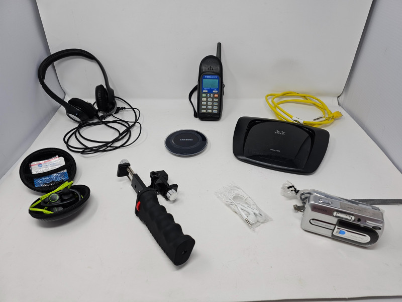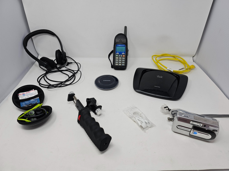 Electronics Miscellaneous Lot Nortell N1911 for BellSouth Cisco/Linksys Model E1000 Wireless N Router 4ft Cat-5 Yellow Patch Cable Samsung Wireless Charging Pad Logitech USB Headphones/Microphone Hspro Wireless Bluetooth Headphones In Case Handheld Phone/Camera Mount Fujifilm FinePix A330 Dugutal Camera Samsung Wired Headphones (New In Plastic) Some missing power cords All Untested!