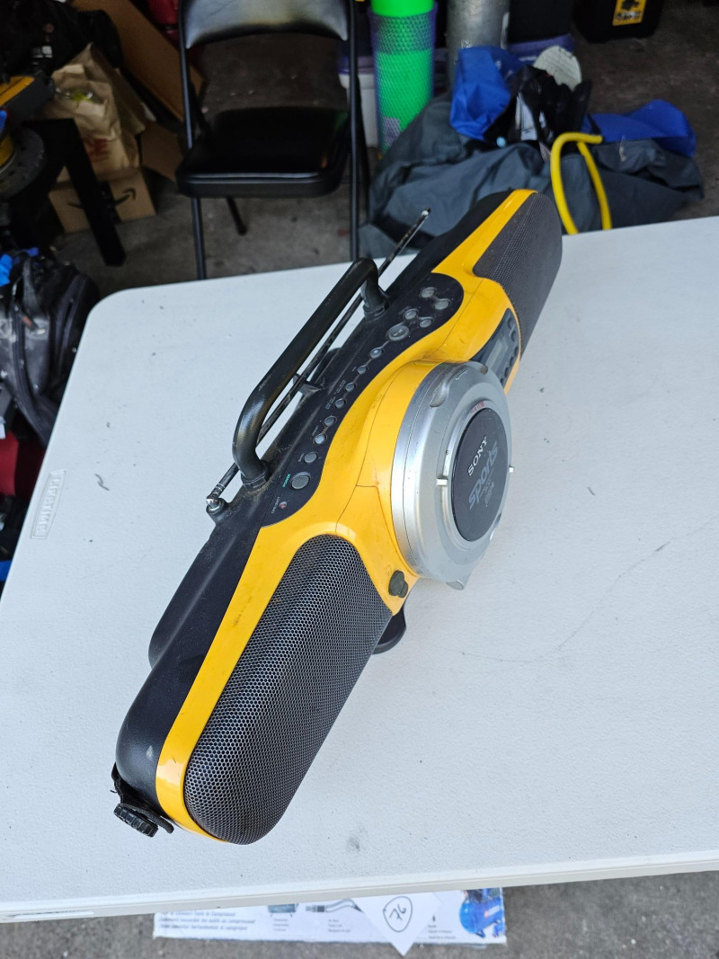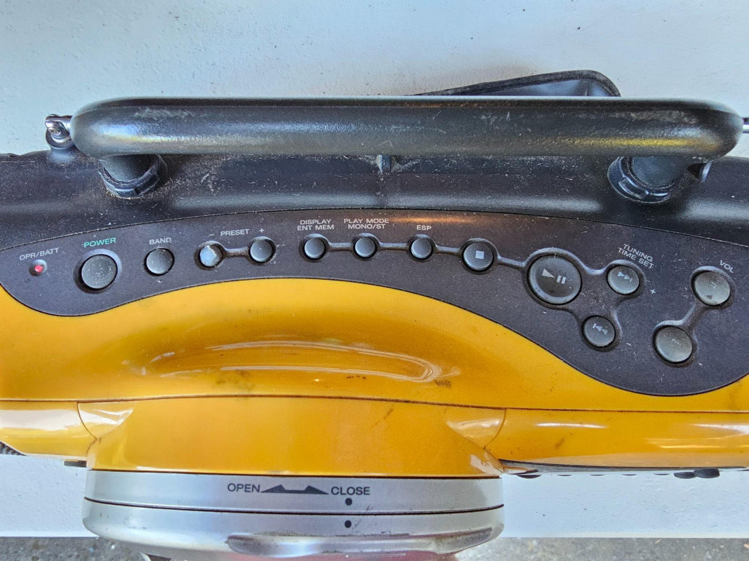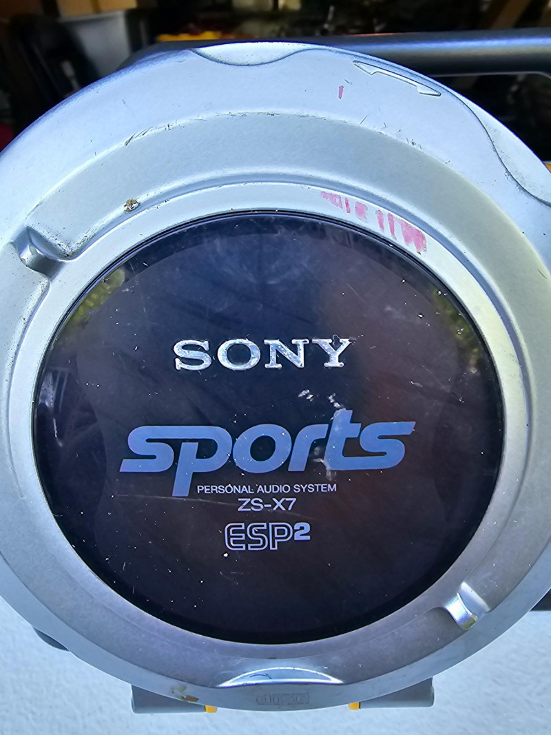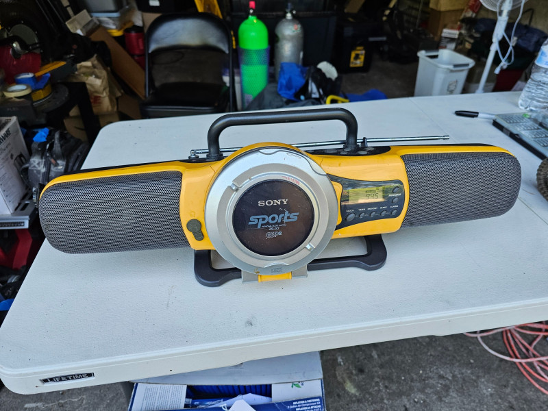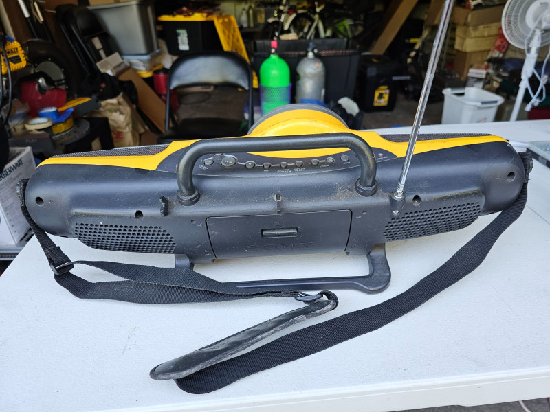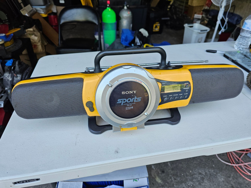 Sony ZS-X7 Sports Personal AM/FM/CD Audio System This is a rare find in working condition! Mfg about 2003 Media Playback: Plays CDs, and has an AM/FM radio. Durability: Designed for active use with electronic skip protection for CDs. Portability: Can be powered by AC (no AC adapter included) or batteries. Release Year: Introduced around 2000, available in black or yellow. Additional Features: Mega Bass for enhanced bass and a sports design. Carry handle is broken on one side (see pics) Includes shoulder strap Tested - Works! 88T x 23"W x 6"D