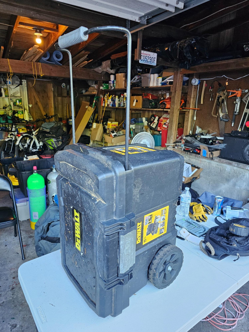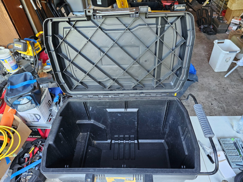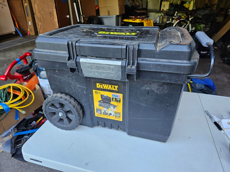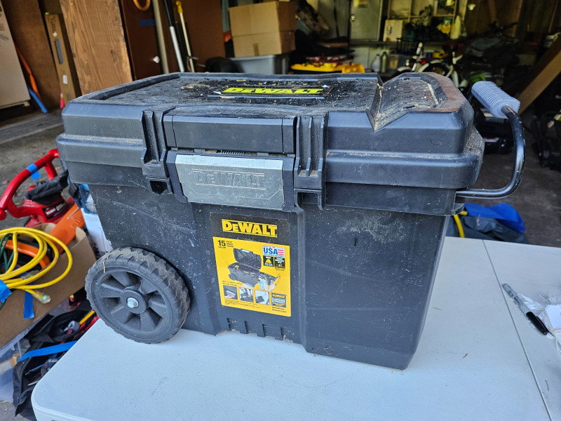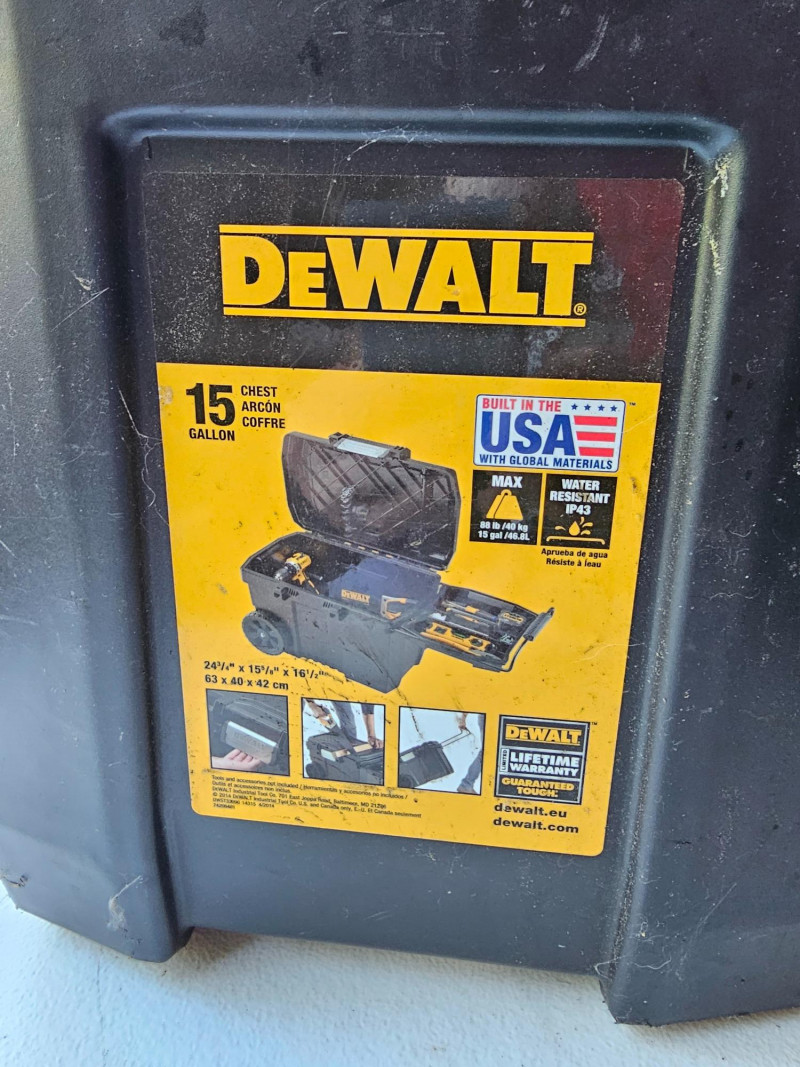 DeWalt 15 Gallon Rolling Tool Chest 15 gallon capacity 90lb load capacity Spring lock lid Extendable carry handle 16.4"T x 24.25"W x 15.5"D