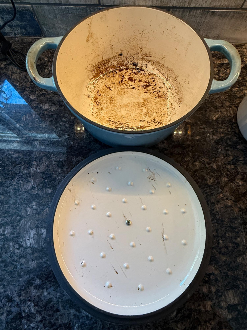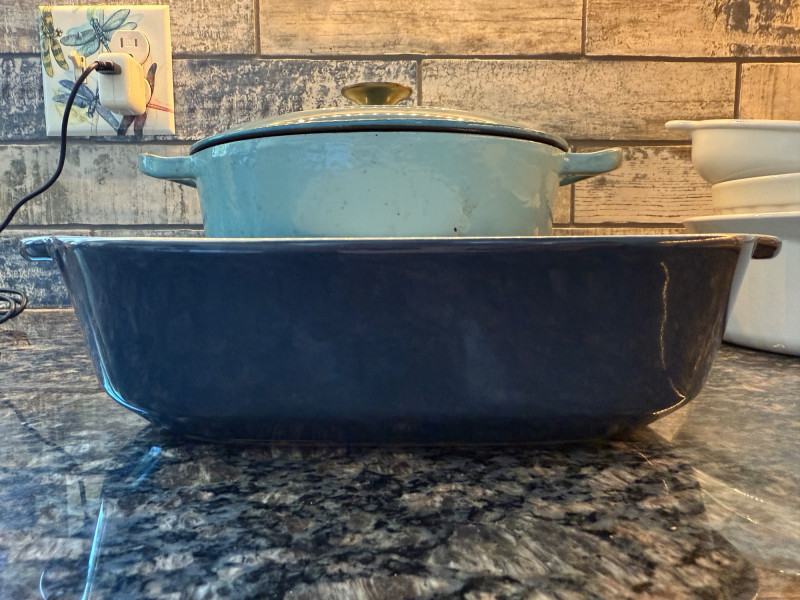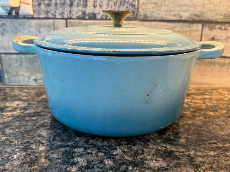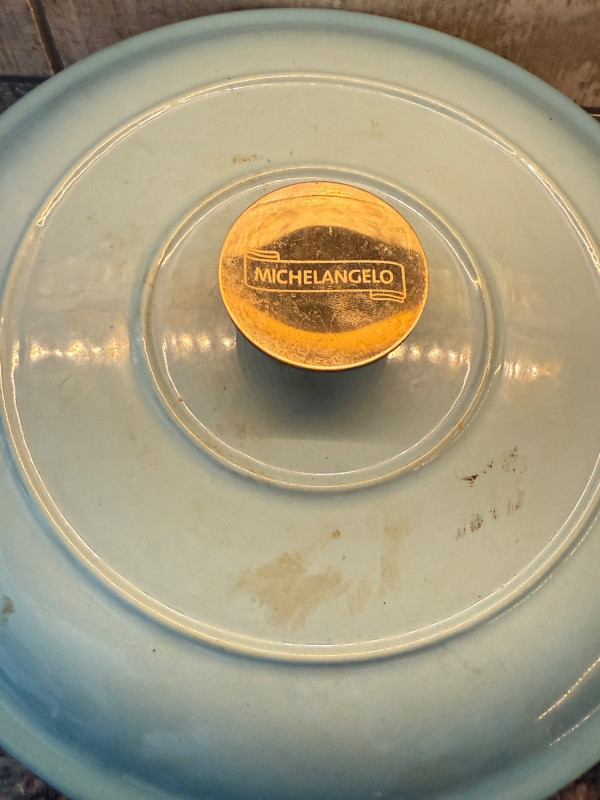 Michelangelo Dutch Oven - Powder blue enamel on cast iron standing the test of time and needs a deep clean. 10” bowl and 5” tall without lid Pyrex Bakers Corningware