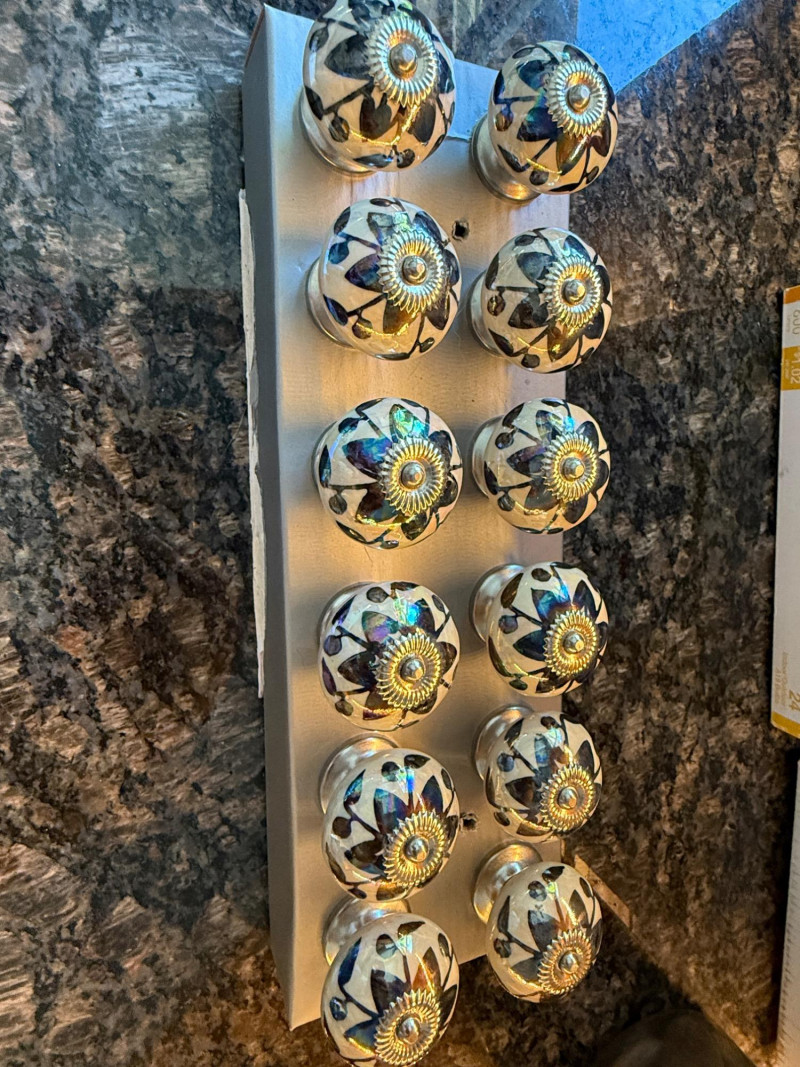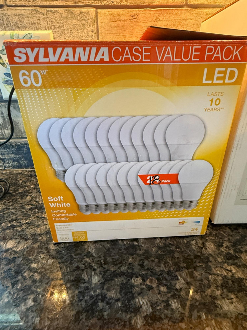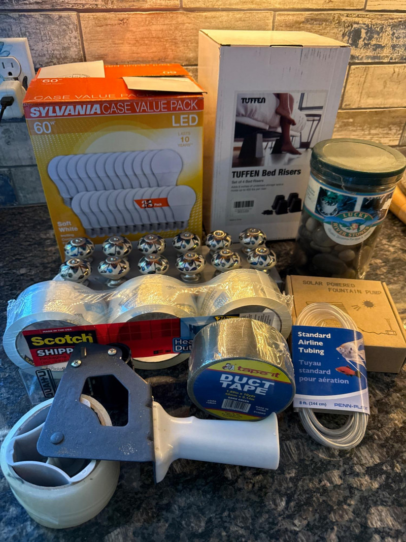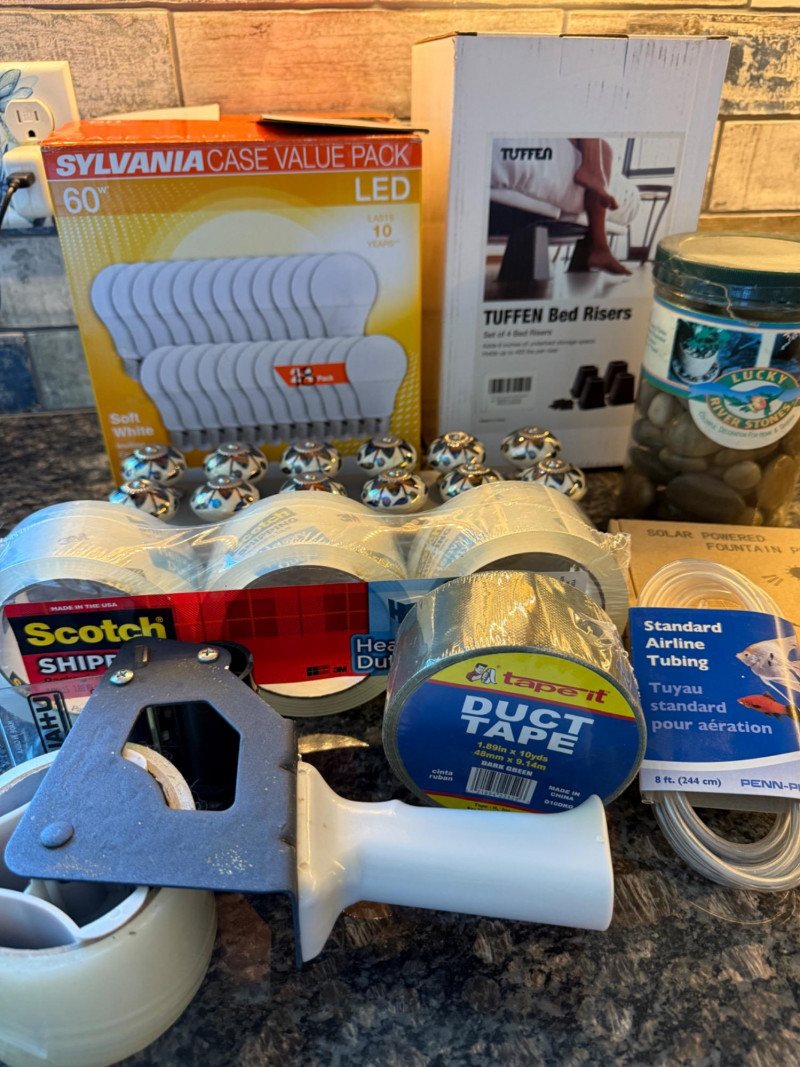 Useful Things 12 Cabinet Pulls Bed Risers 18 60W LED Lightbulbs Tape gun with 3 new rolls Duct Tape Decroative Polished River Stones