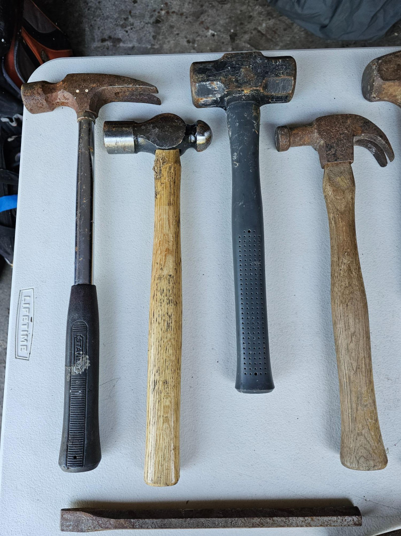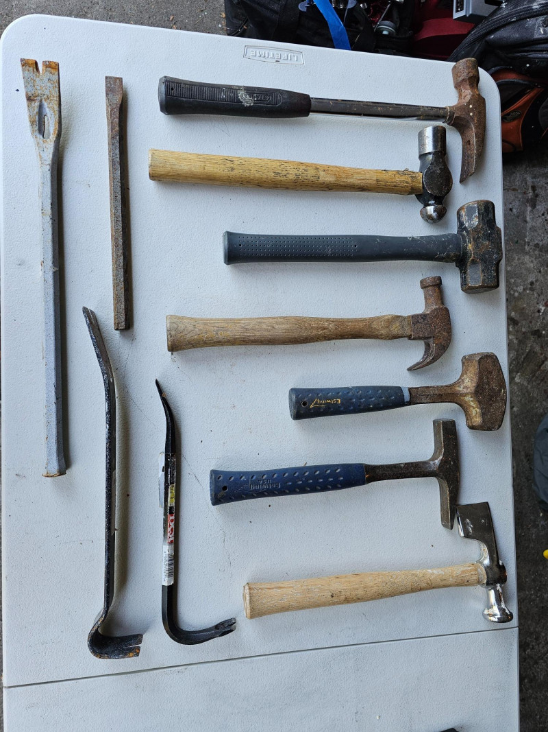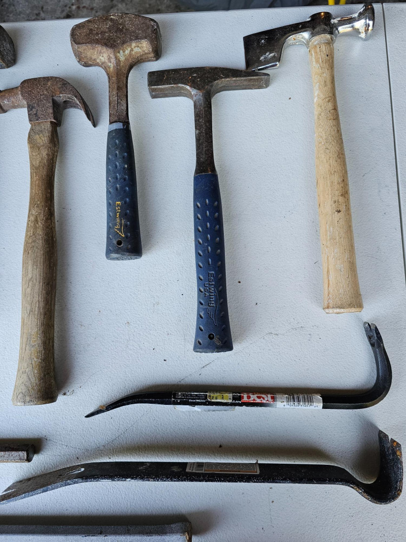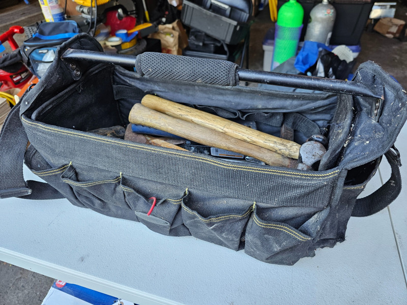 Tool Bag Full Of Hammers (7) Hammers (2) Nail Pullers (1) Flat Bar 11 Tools in all! 10"T x 19"W x 9"D