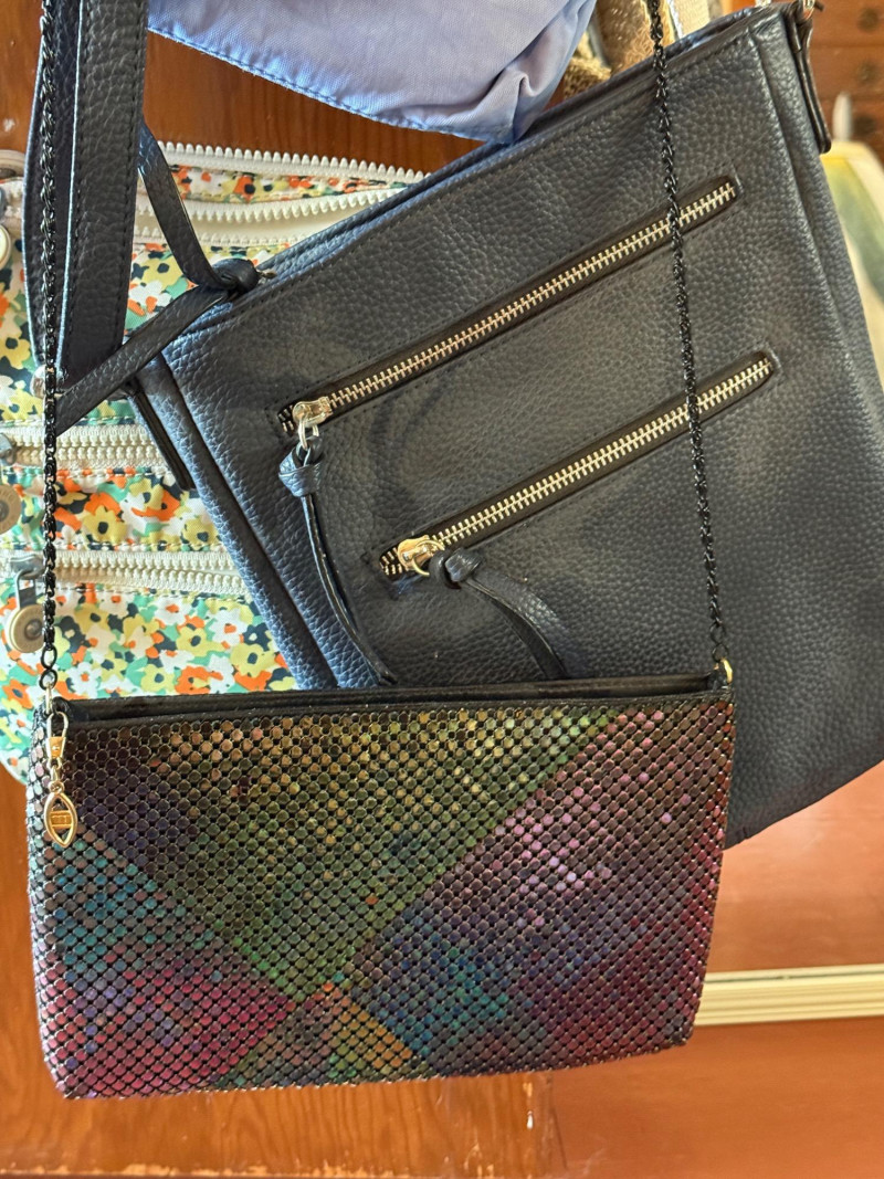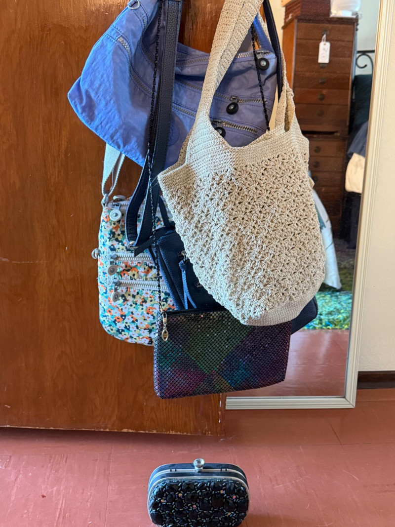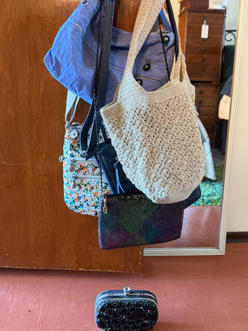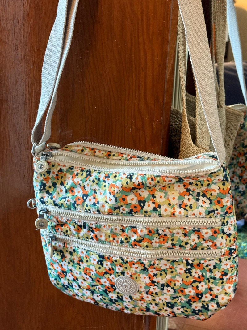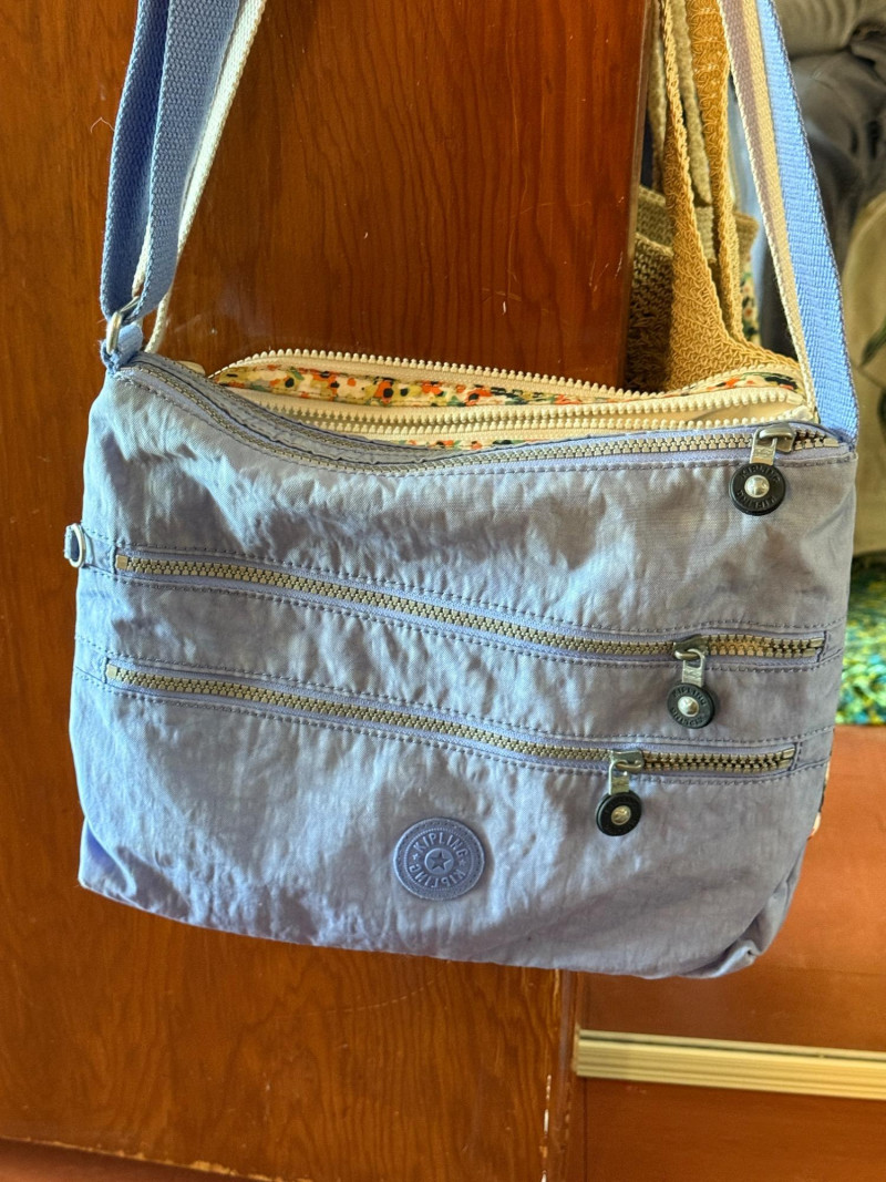 6 Shoulder Bags - 2 Kipling6 total purses, 2 are the floral multi-zipper and blue in the same. Ivory crochet slouch bag with satin lining.