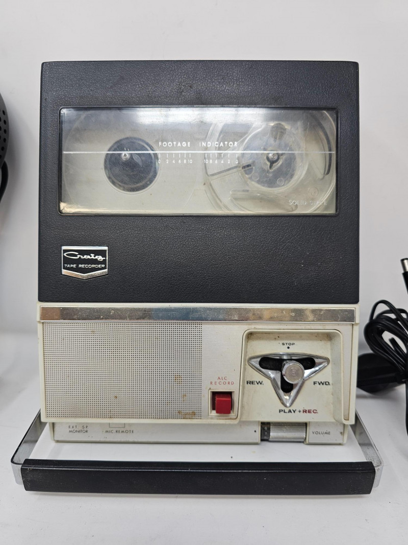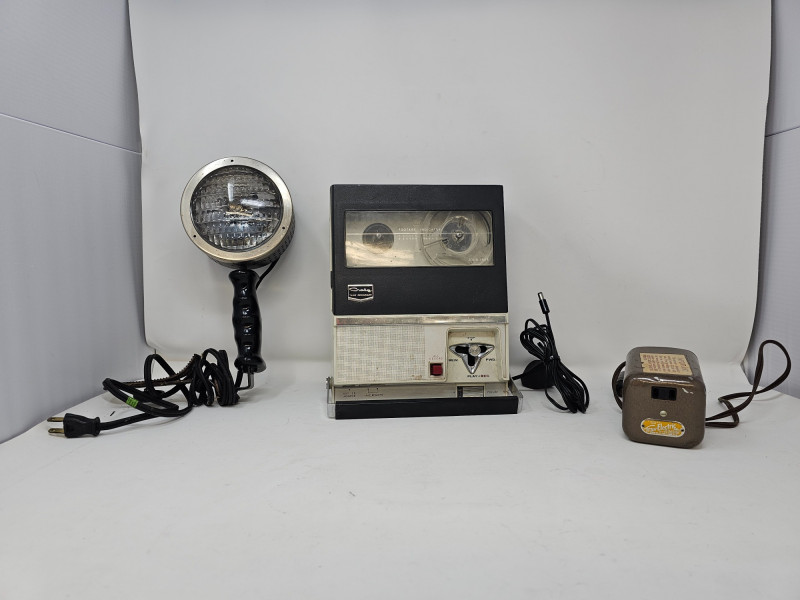 (3) Vintage Miscellaneous Electronics (1) Vintage Craig Model 212 Portable Reel to Reel Tape Recorder (includes power cord) (1) Movie-Lite Model 850D vintage movie light, likely used for filming with Super 8 or other older film cameras (includes power cord and bracket - works! (1) Trav-Electric Sr 12v Input Converts To 110 Volts (includes hard-wired 12v cord) Just some fun things!