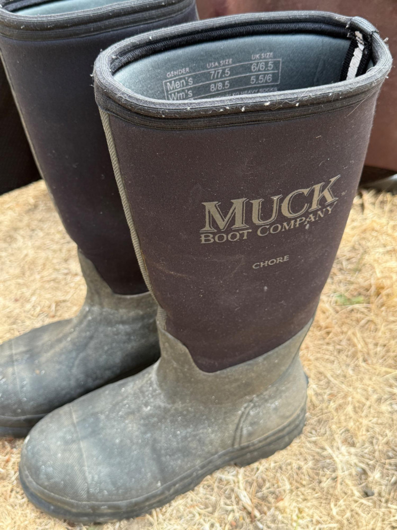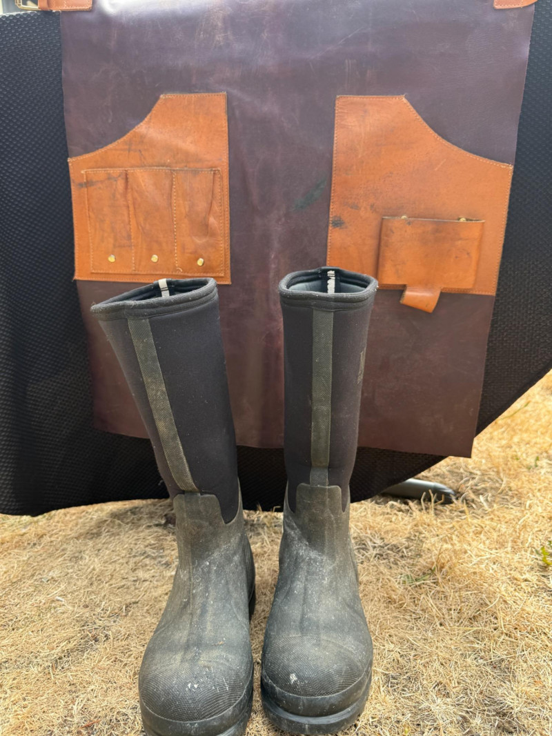 Handcrafted Leather Apron & M7/W8 Muck Chore Boots Handcrafted Leather Apron 21”x42” protective apron with 23.5” buckle and strap M7/W8 Muck Chore Boots