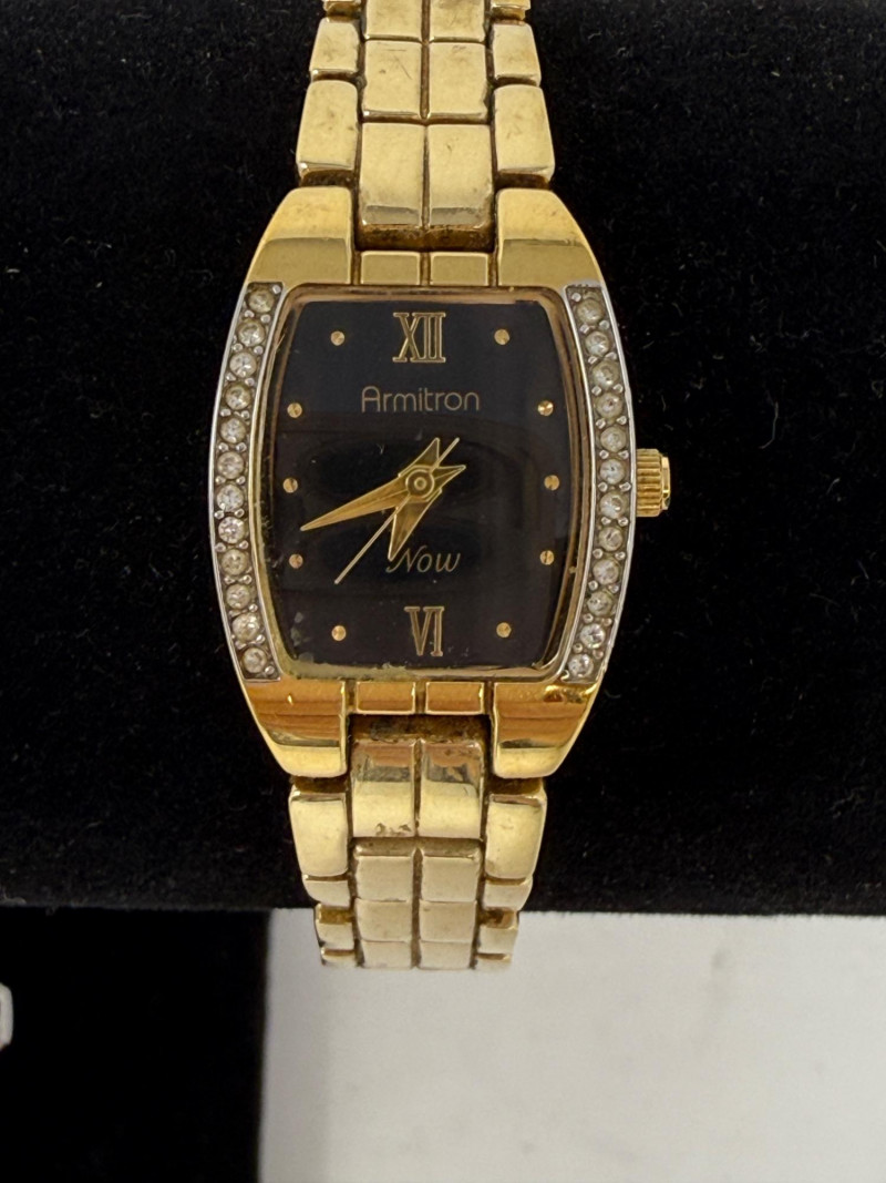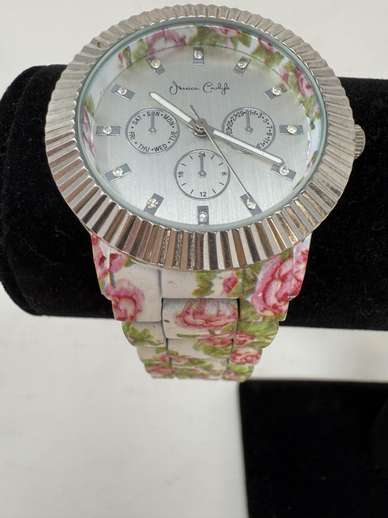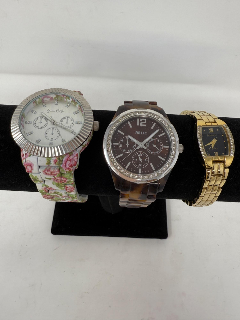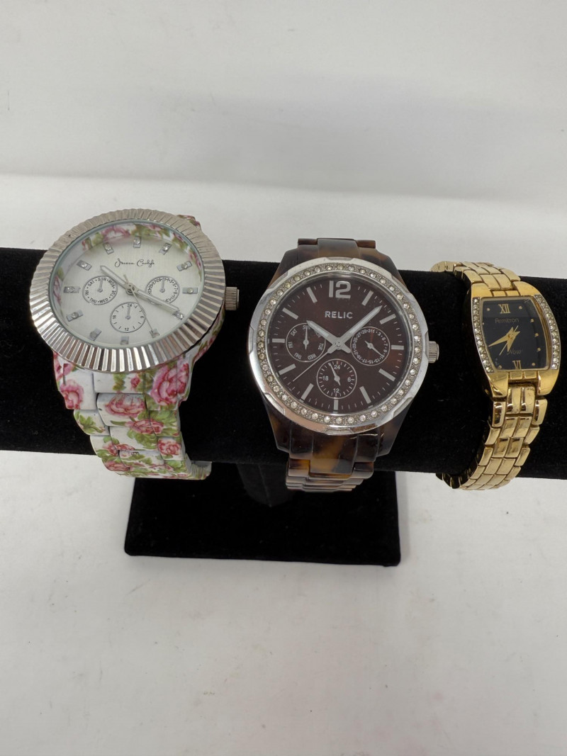 (3) Watches Relic- Armitron - Jessica Carlyle Relic Tortoise shell band Armitron gold with crystal accents Jessica Carlyle with rose band Not tested, needs batteries