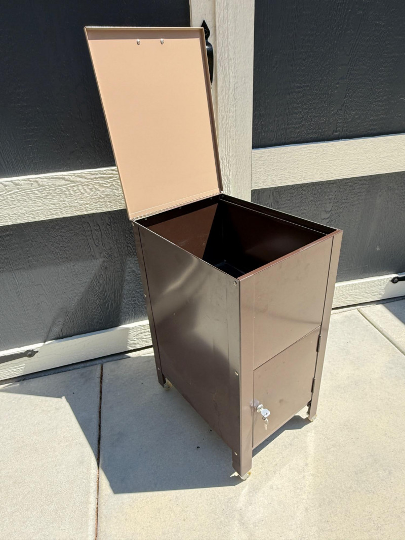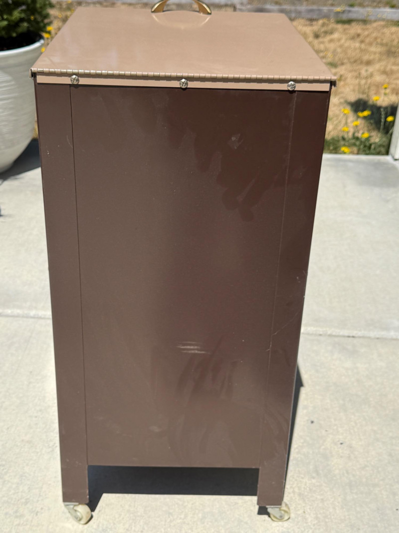 Rolling Locking Cabinet 13.5x18x27.5” on wheels. lid is on hinges for full extension opening. Locking cabinet with keys. Dark and milk chocolate brown.