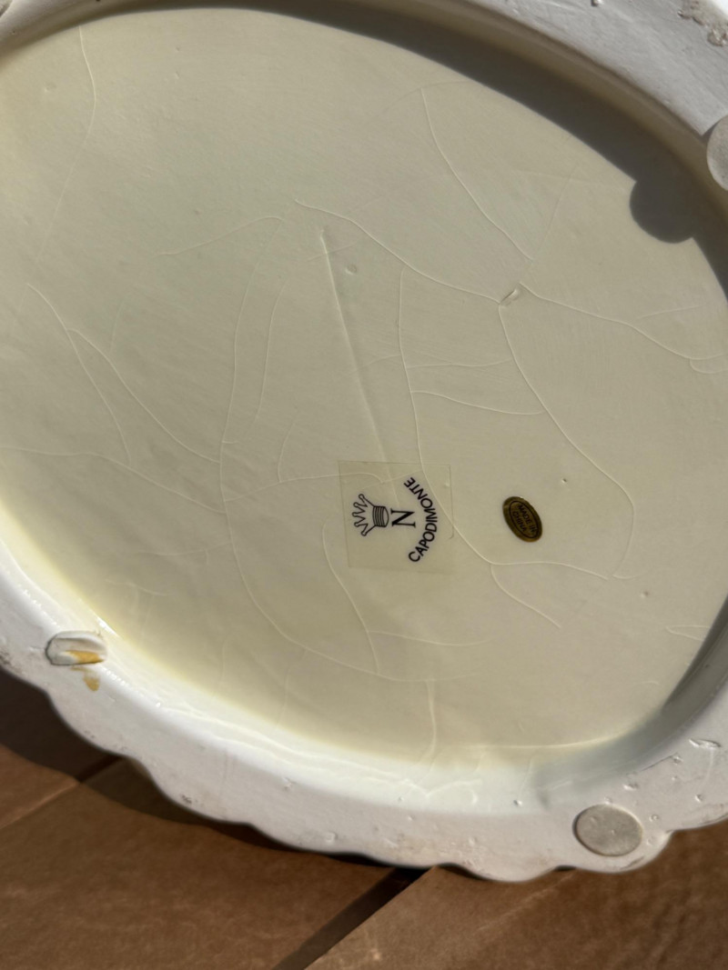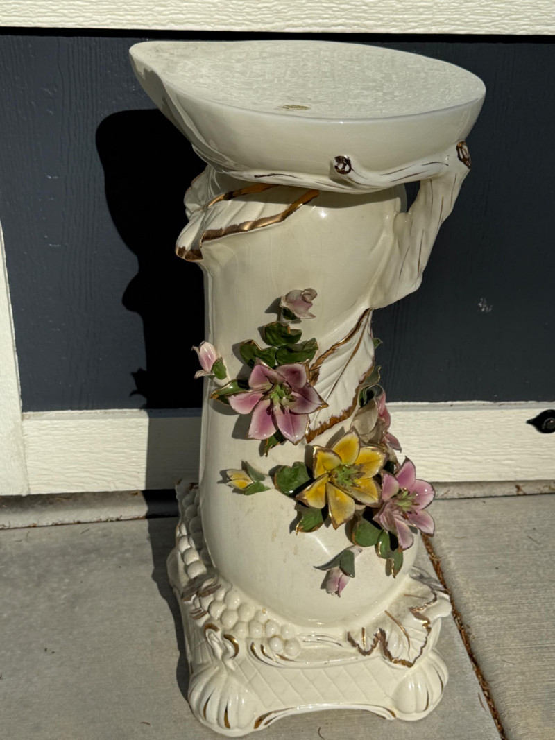 Capodimonte Porcelain Pedestal & Planter Set Small chip on 12x8” planter, nothing noted on the 13x26” pedestal. Production ceased for a time, but was elsewhere revived in the 19th century. The pieces often feature elaborate floral arrangements, cherubs, and mythological scenes, all meticulously hand-painted. The mark of the crowned 'N' over the word 'Capodimonte' is a hallmark of authenticity, though many similar styles have been produced by other manufacturers, especially in later years.
