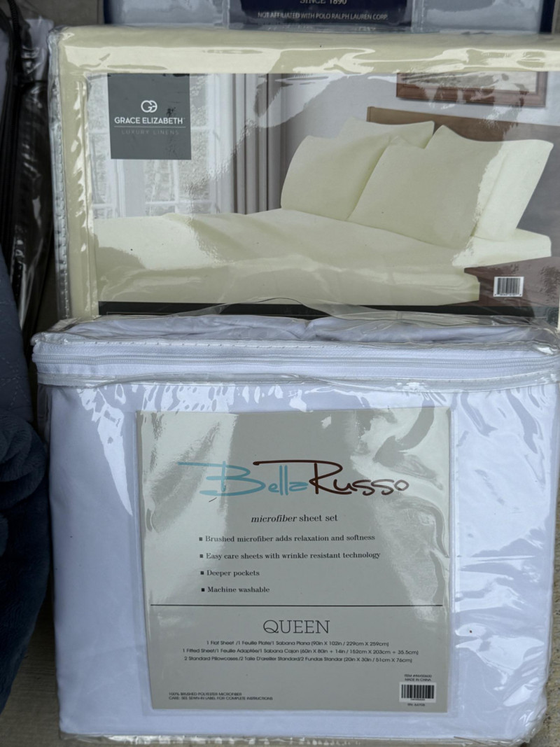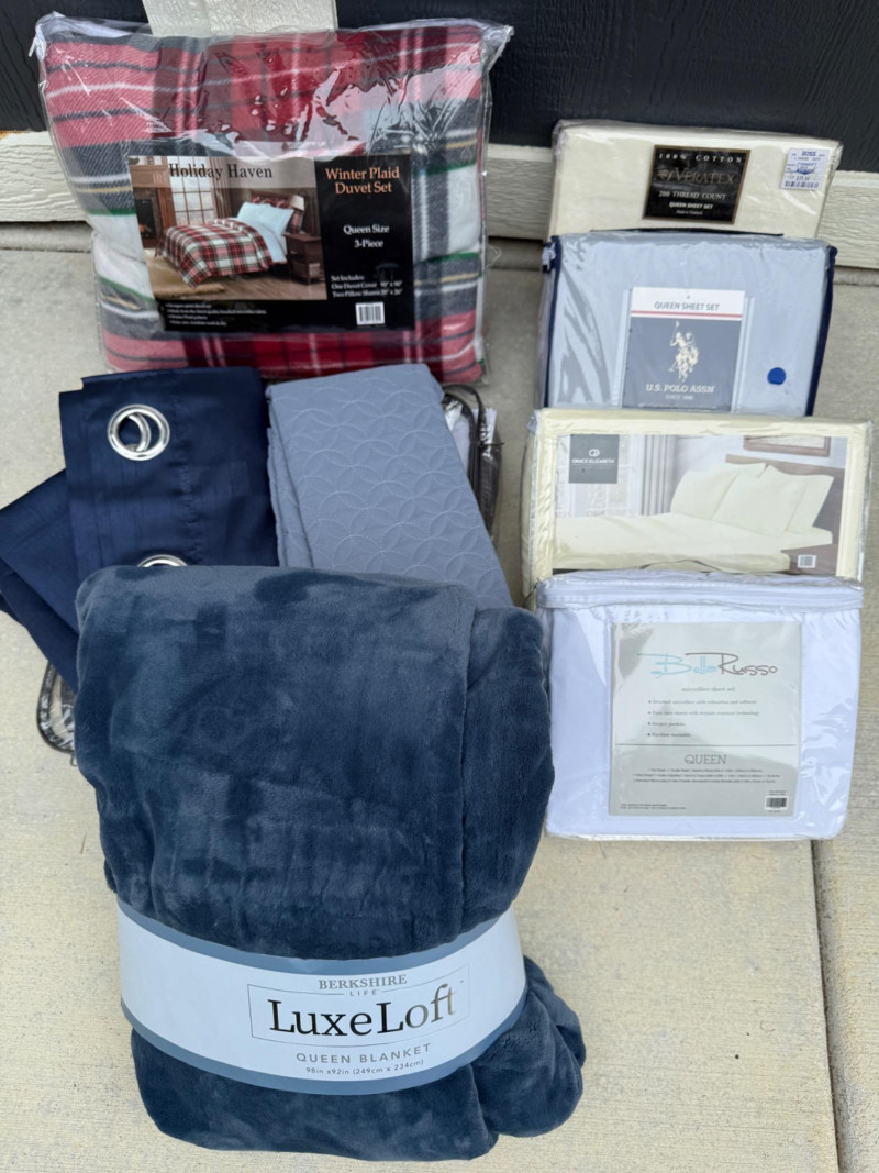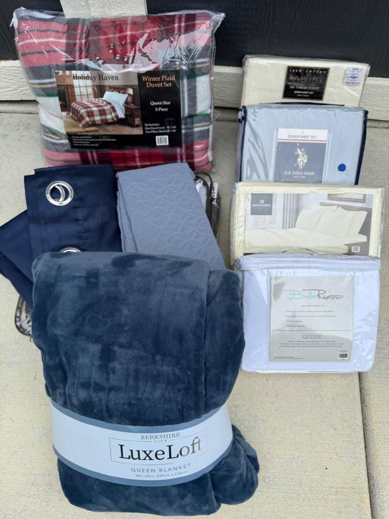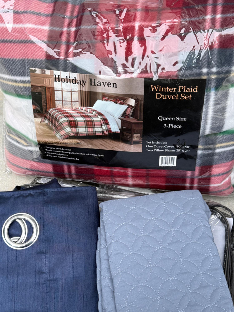 Queen Bedding and Curtains - New 4 new in packaging queen sheet sets. Winter plaid duvet set queen with two pillow shams. Two standard pillow shams. Lux loft queen blanket.