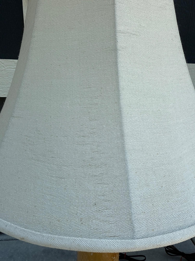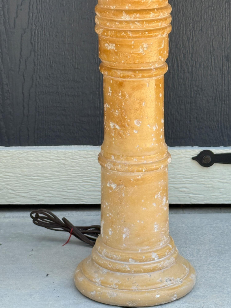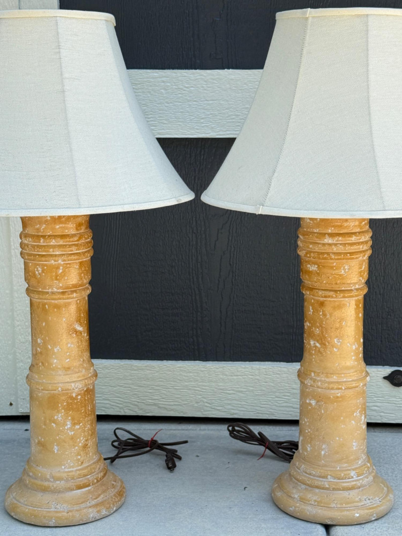 (2) Mediterranean Style Plaster Lamps 9” base, 19” shade, 25” tall Twist turn on Knob is missing from one lamp.