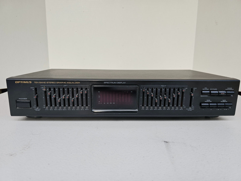 Optimus 10 Band Stereo Graphic Equalizer Model #31-2030 Spectrum Display The VTG Optimus 31-2030 Ten Band Stereo Graphic Equalizer is a classic piece of vintage audio equipment, reflecting a specific era in consumer electronics when users sought greater control over their sound systems. Produced by Optimus, a brand associated with RadioShack, this equalizer was designed to integrate into a home stereo setup, typically connected between a receiver/amplifier and a source component like a tape deck or CD player It indicates that the unit offers ten adjustable frequency bands per stereo channel, totaling 20 individual sliders for precise manipulation of the audio spectrum. These bands typically cover frequencies ranging from the very low bass (e.g., 30Hz or 60Hz) up through the mid-range and into the crisp highs (e.g., 15kHz or 20kHz) Powered On - Lights Work!