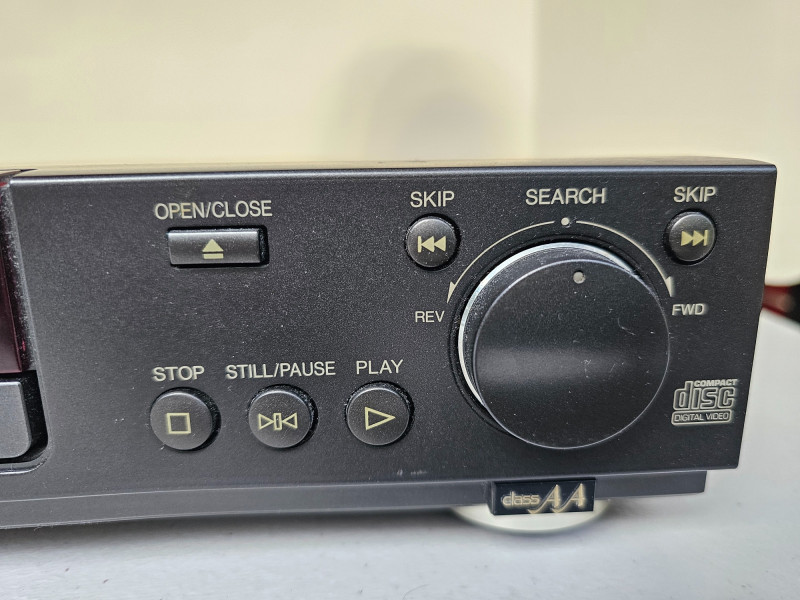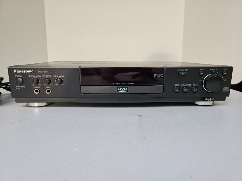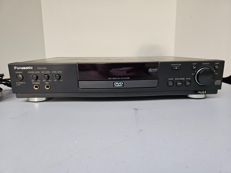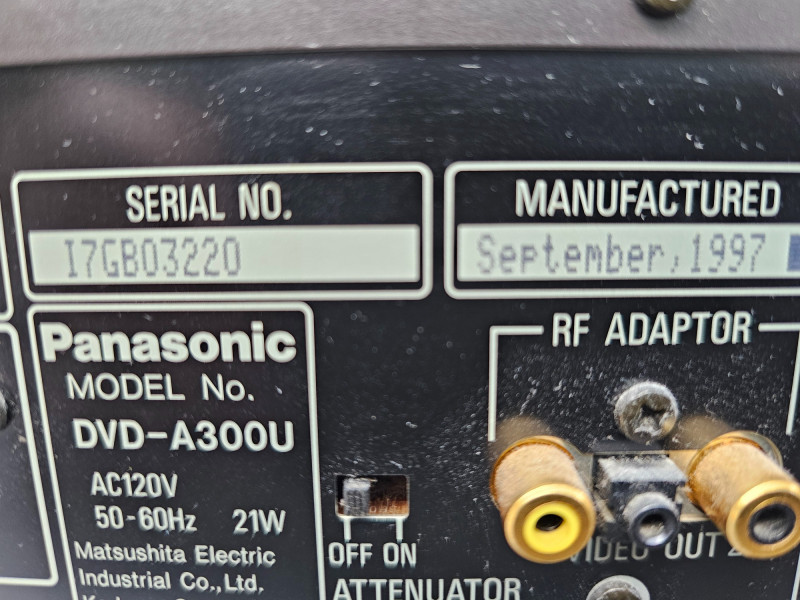 Panasonic DVD-A300 DVD/Video CD/CD Player Model #DVD-A300U Mfg Date: 9/1997 Class AA Research shows this may have been one of Panasonic's first DVD players (manufactured in 1997). This might be a cool piece of history, and it still works. This DVD Player is pre-HDMI cables! Includes power cable Tested - Works!