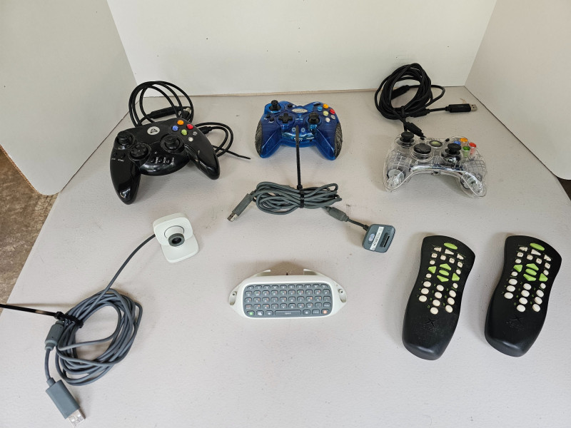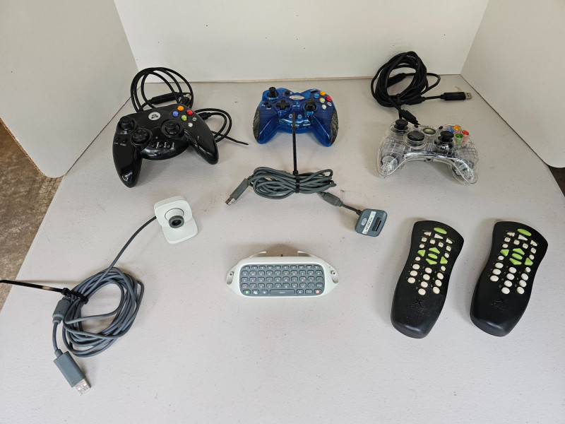 Microsoft XBOX Accessories (1) Wired Clear Afterglow XBOX Contoller (1) Wired Black Arsenal XBOX Controller (1) Wireless Blue Intec XBOX Controller (1) Wired Microsoft Live Vision Camera (1) White Microsoft XBOX 360 Chatpad (2) Black Microsoft XBOX DVD Remotes (1) Microsoft XBOX 360 Play & Charge Cable All Items Untested!