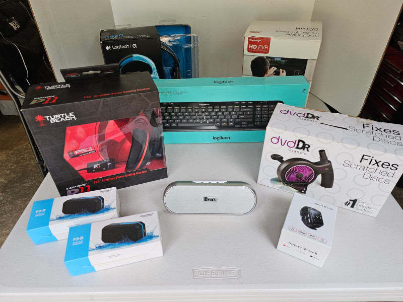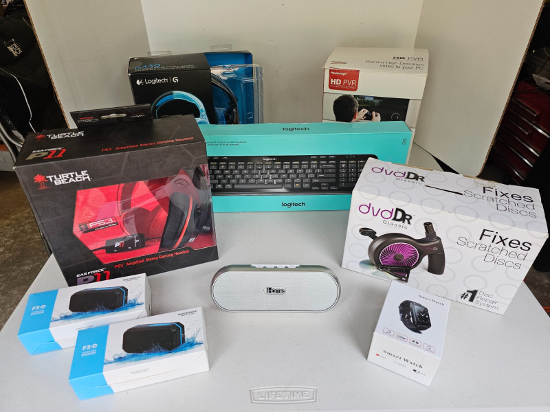 New Or Nearly New Electronics In Box Logitech G430 Surround Sound Gaming Headset Turtle Beach Ear Force P11 PS3 Amplified Stereo Gaming Headset Hauppauge HD PVR - Personal HDTV Recorder Logitech K360 Compact & Slim Wireless Keyboard & Mouse DVD DR Classic Disc Repair System Black Generic Smartwatch iHome iDM12 Rechargeable Bluetooth Speaker (no box) (2) F3-D Waterproof Rechargeable Bluetooth Speakers Untested!