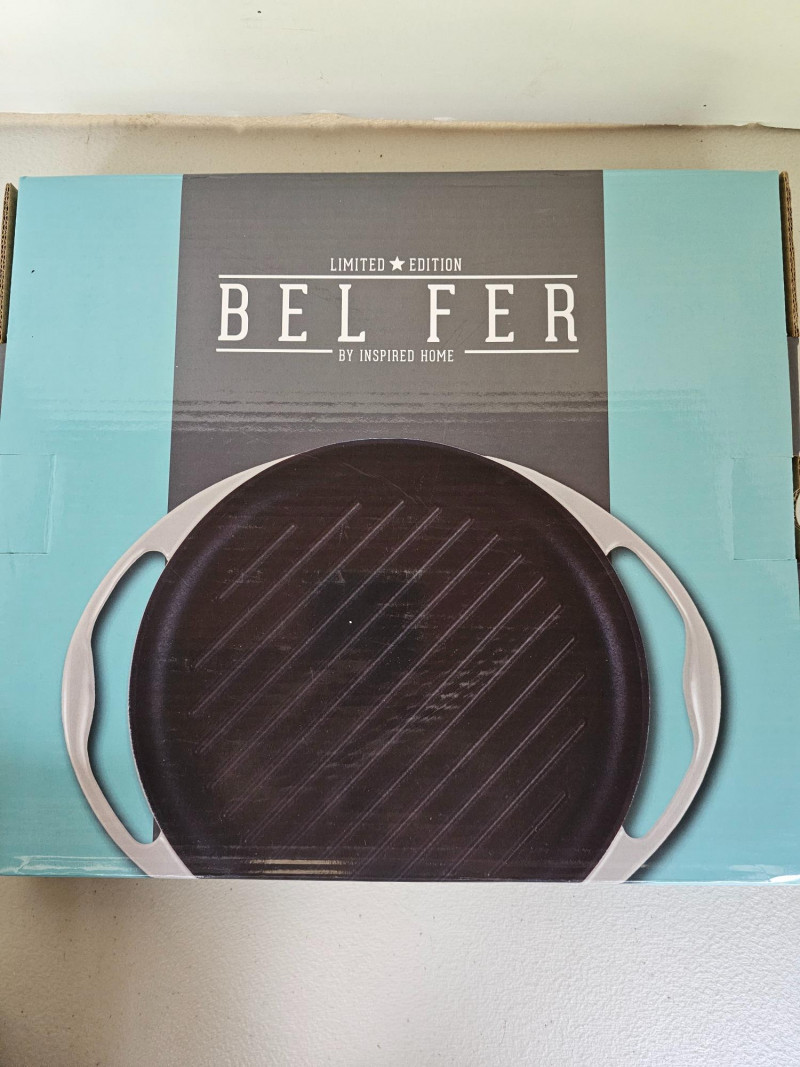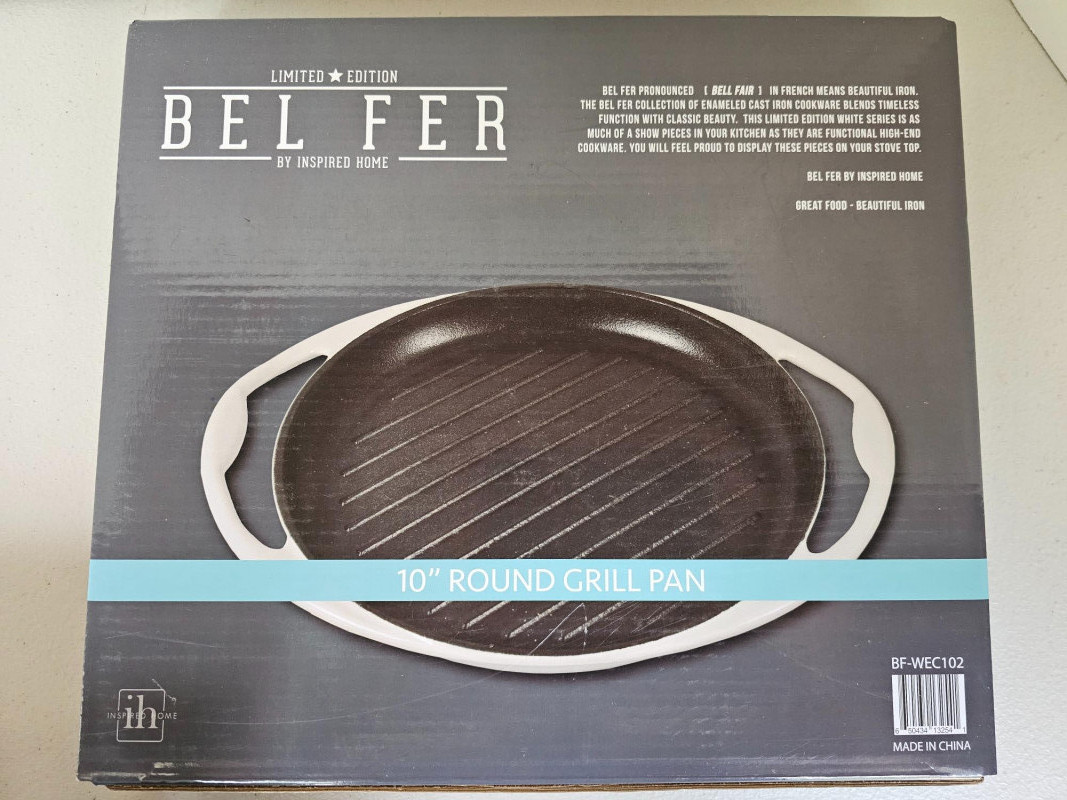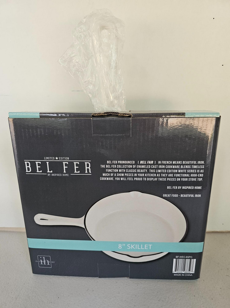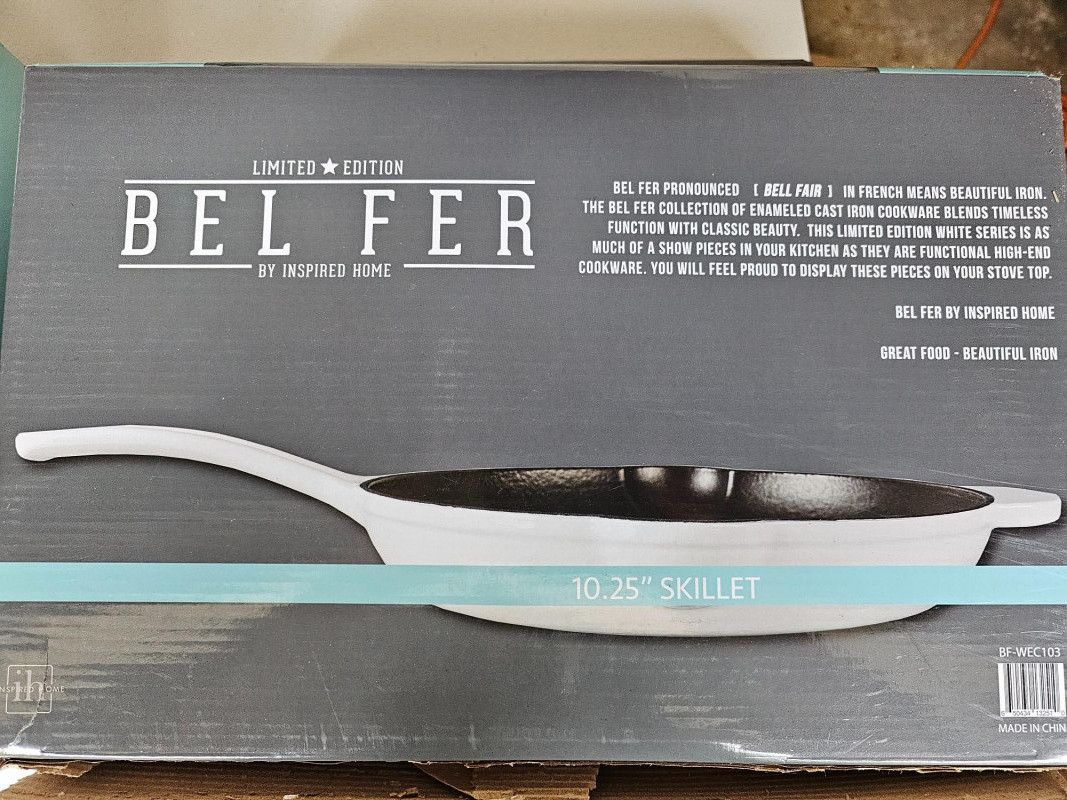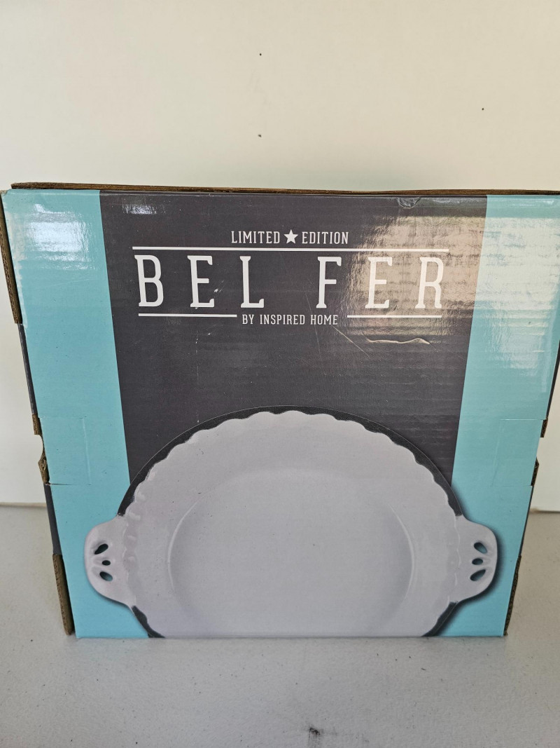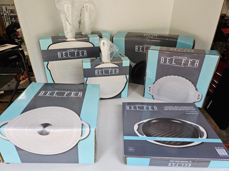 Bel Fer Cookware Collection (New In Box)Box! Bel Fer Collection of enameled cast iron cookware Limited Edition White Series (1) 10.25" Skillet - BFWEC103 (2) 10" Grill Pans - BFWECSQ10SPO (1) 8" Skillet - BFWEC8SPO (1) 10.25" Pie Pan - BFWEC104 (1) 10" RoundGrill Pan - BFWEC102 (1) 5 qt Dutch Oven - BFWEC5QRTSPO All 7 pieces new In box!