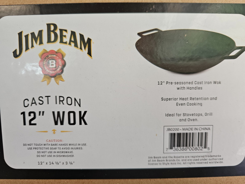 4 Piece Jim Beam Cast Iron Cooking Set (New In Box) (1) Jim Beam Cast Iron 12" Wok (1) Jim Beam Cast Iron 12" x 10" Skillet & Griddle Set (1) Jim Beam Cast Iron 10.5" Griddle All 4 pieces are new in packaging!