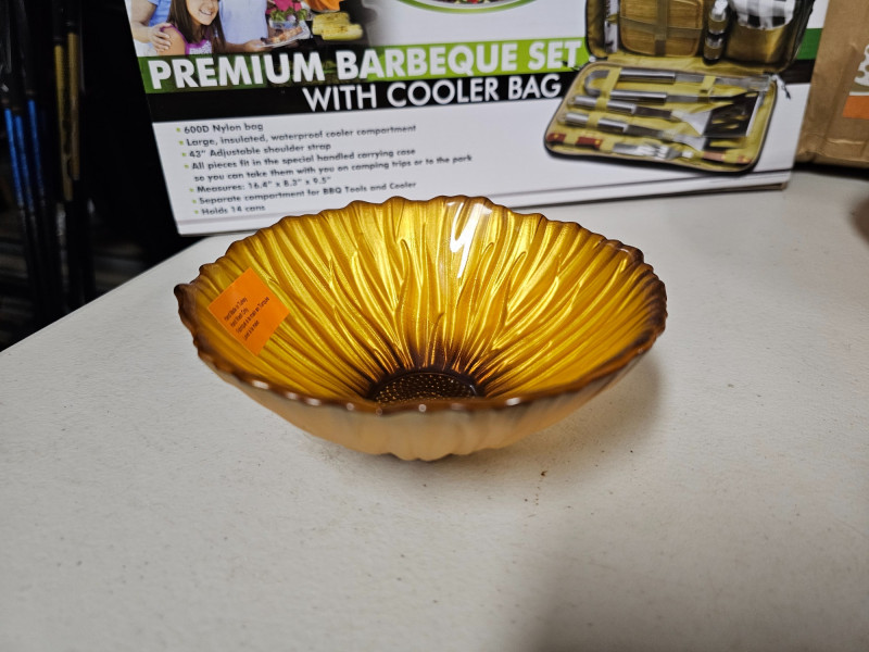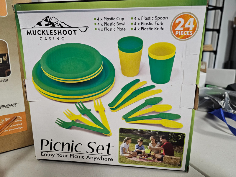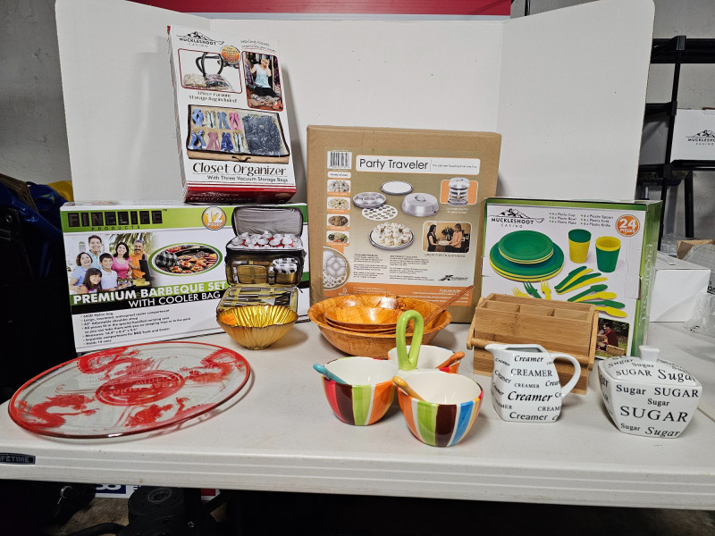 (12) Muckleshoot Casino Member Gifts (1) 12pc Premium BBQ Set With Cooler Bag (1) Party Traveler Kit (1) Picnic Set (1) Wood Salad Bowl Serving Kit (2) Asian Red Decorated Glass Platters (1) Glass Flower Bowl (2) 3 Cup Colorful Bowls With Mini Spoons (1) Cream & Sugar Bowl With Lid (1) Wooden Utensil Holder (1) Closet Organizer All items in original boxes!