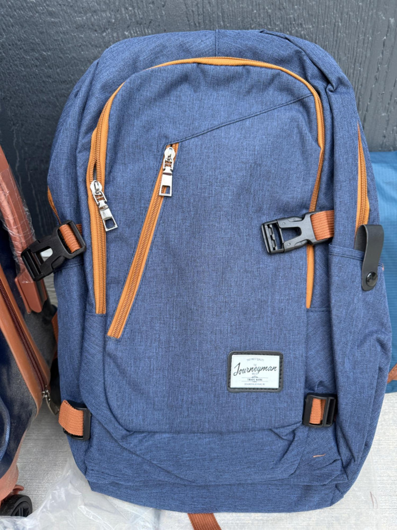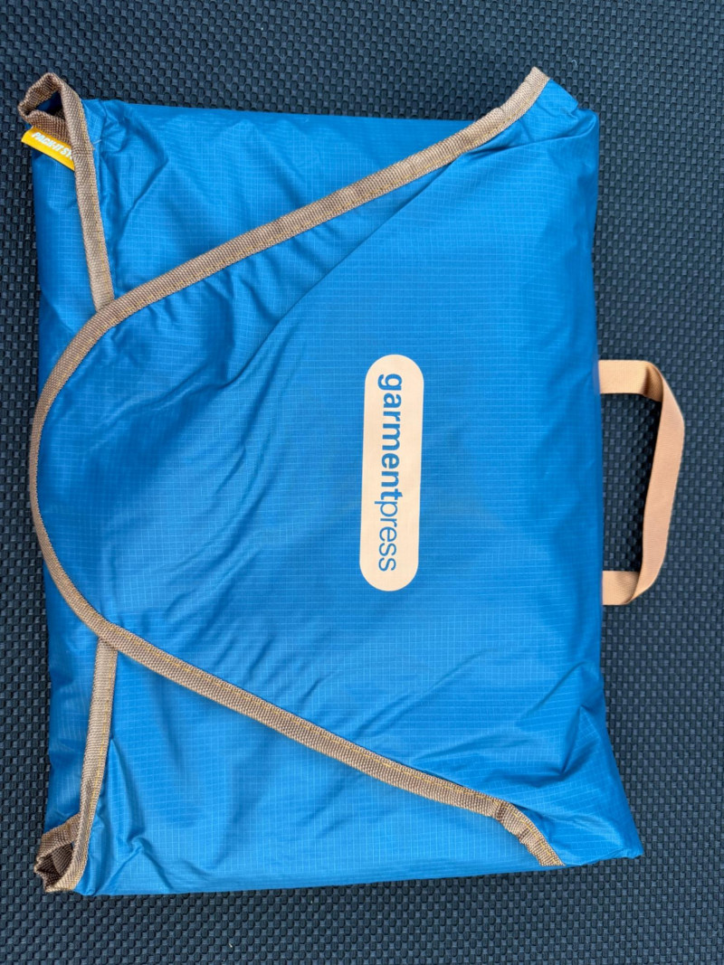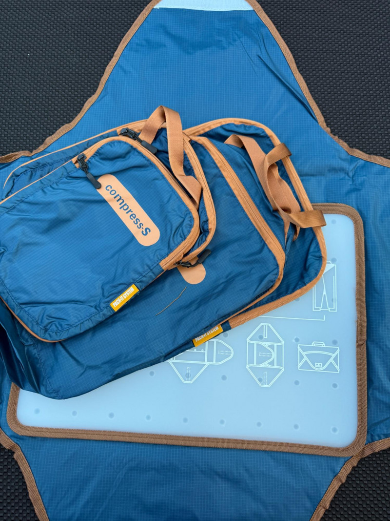 Garment Press Compression bag travel kit Hard side carry-on suitcase Journeyman Bag Co backpack blue and brown.