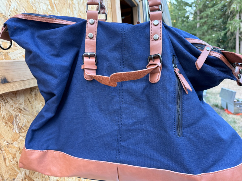 Large canvas and vinyl 2 handle duffle bag with shoulder strap.