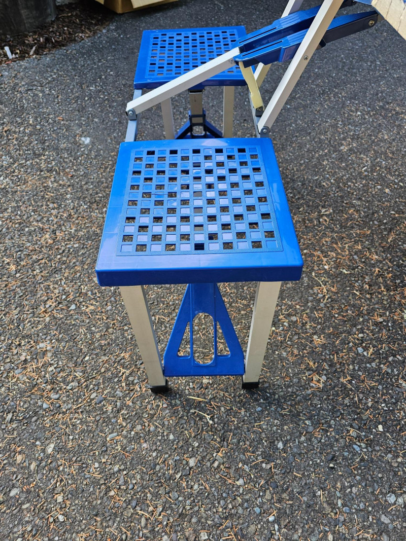Camp 4 Picknick Lite Folding Bench/Table It features a durable aluminum frame, a spacious ABS tabletop, and four comfortable stools. The set is designed for easy transport and quick setup, folding compactly into a case with a handle. It includes a parasol holder in the center of the table