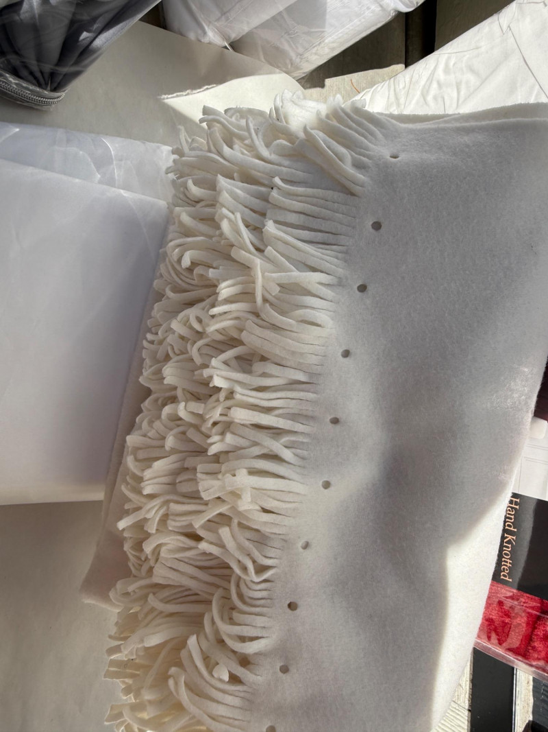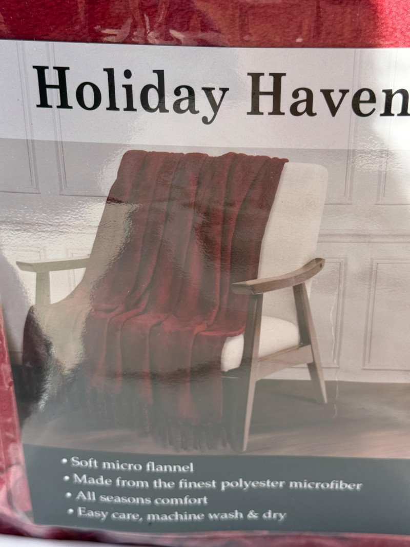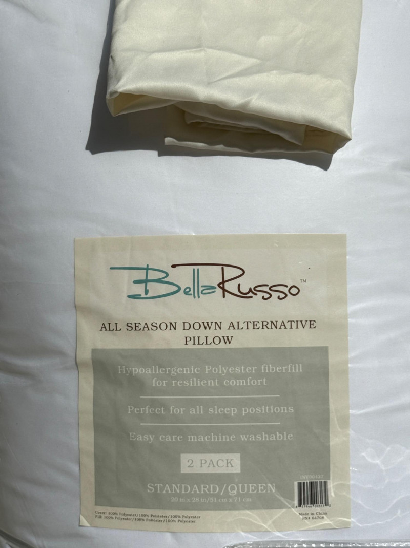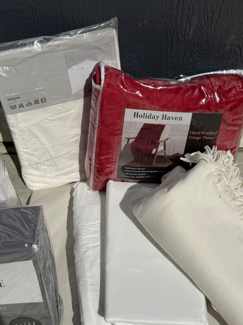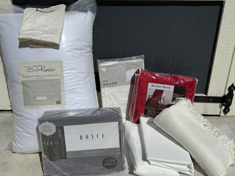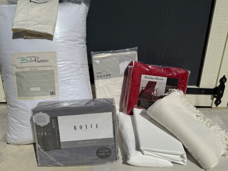 (2) Bella Russo Down alternative standard size bed pillows Holiday Haven red velvety fringe throw blanket. Unlabeled bedding, most likely twin sheets and ivory fringe throw blanket. Queen sheet set. Completeness unknown.