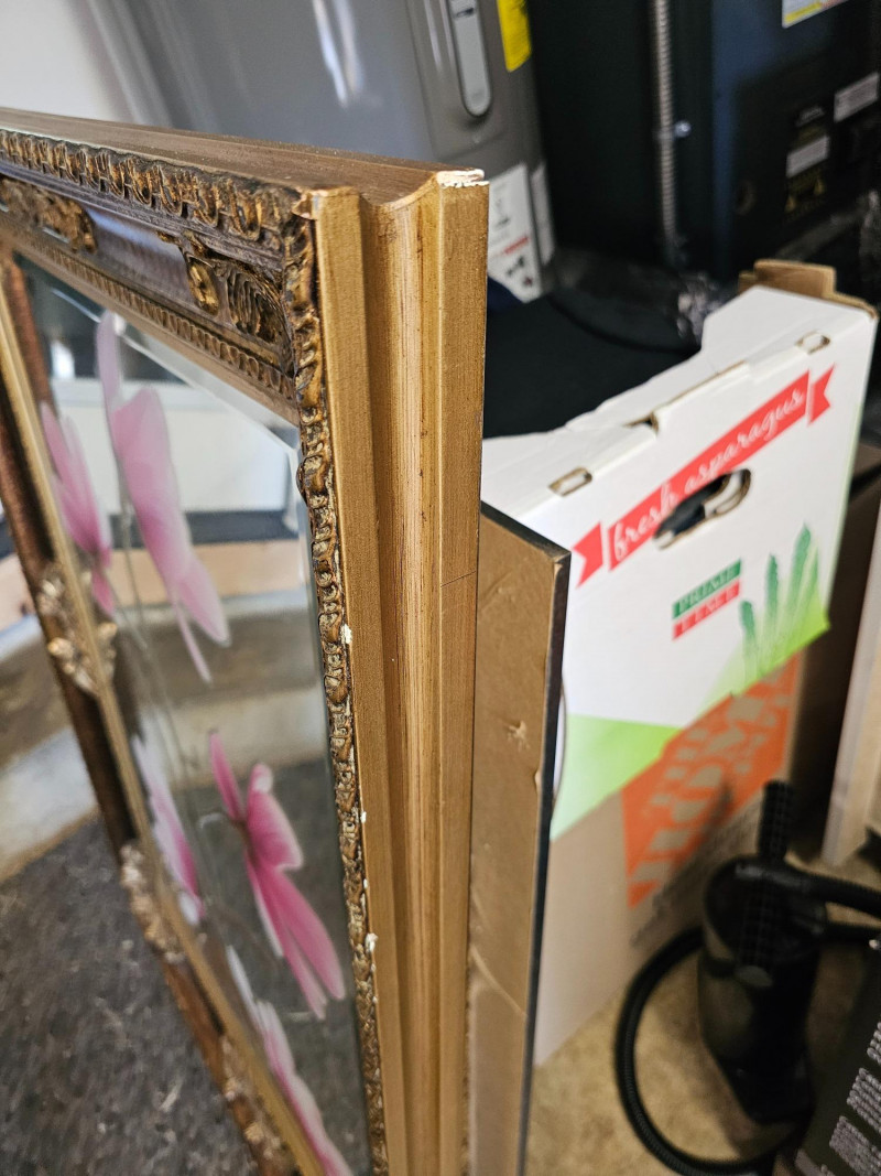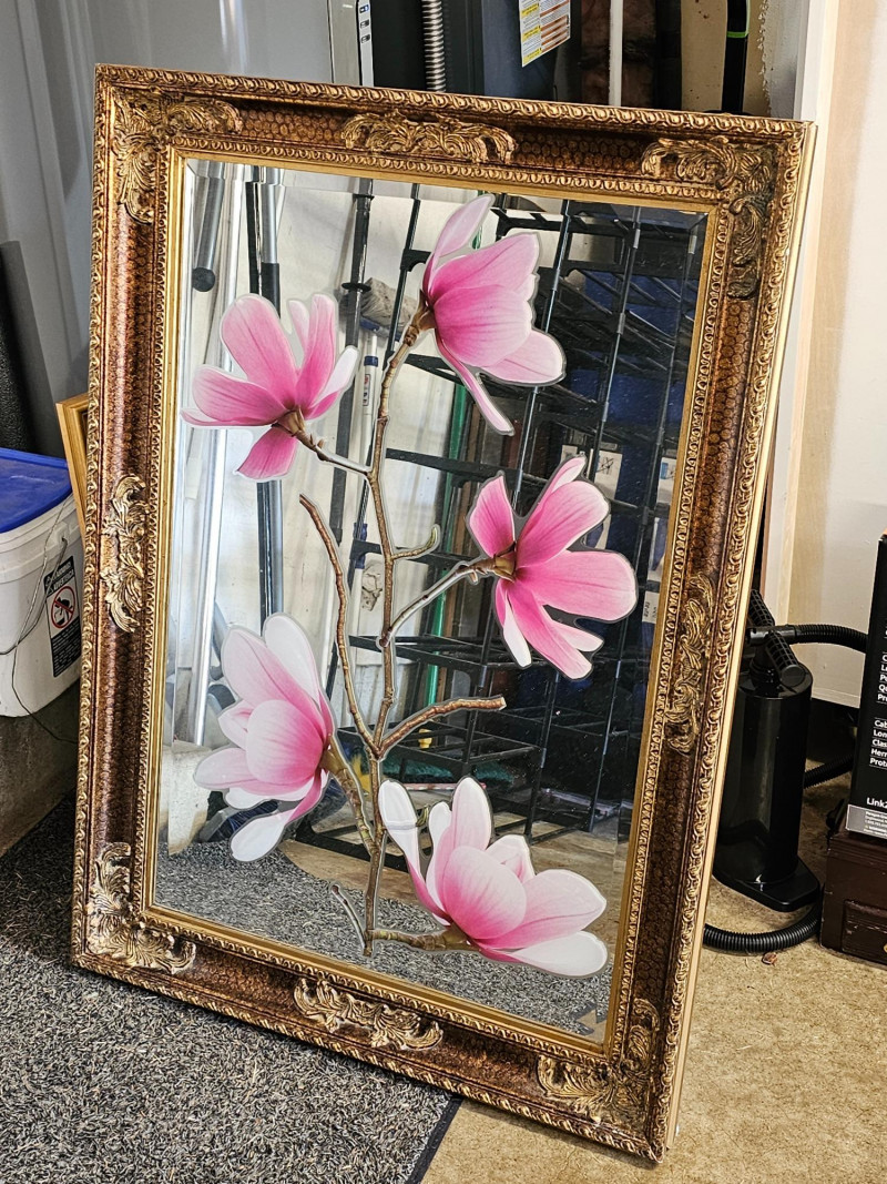 Large Framed Mirror With Pink Flower Cling Or Decal Ornate frame Framed like a piece of art, this beveled wall mirror is pretty nice Looks like cling or decal can be removed! A few chips on one side of the frame 42.5"T x 30.5"W