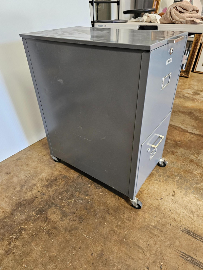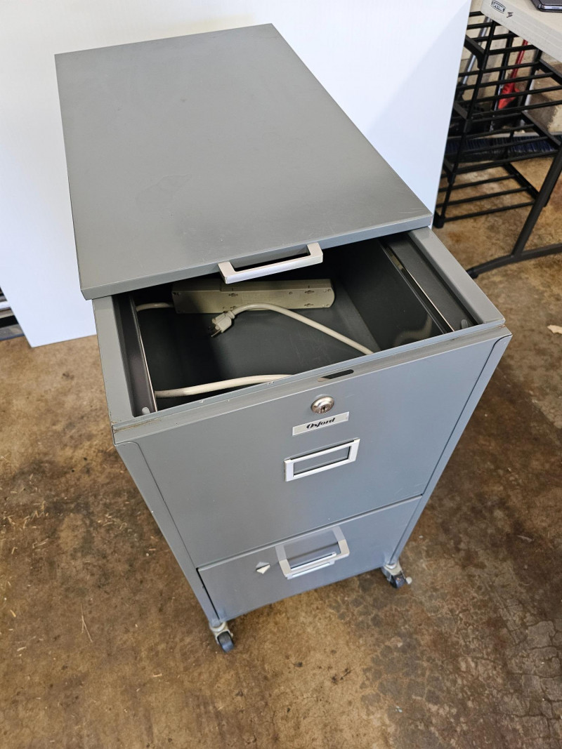 Oxford Top Load Sliding Lid & Single Drawer Metal File Cabinet Top lid slides back to access top of cabinet, and can open fully and retract down the back wall Bottom drawer as well Roll easily on small casters No keys 30"T x 15.25"W x 24.25"D