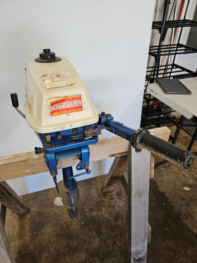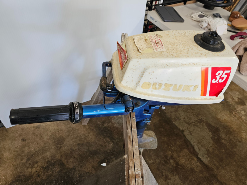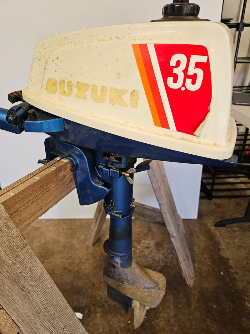 Suzuki DT 3.5hp 2-Stroke Outboard Boat Motor Compact 2-stroke engine commonly used for inflatables, canoes, jon boats, or small skiffs Most likely made in 1982/1983 Tiller handle with twist-grip throttle Has been stored in a dry basement Could use a clean-up (I just wiped it off) Unknown running condition Untested! 38"T x 14"W x 27"D