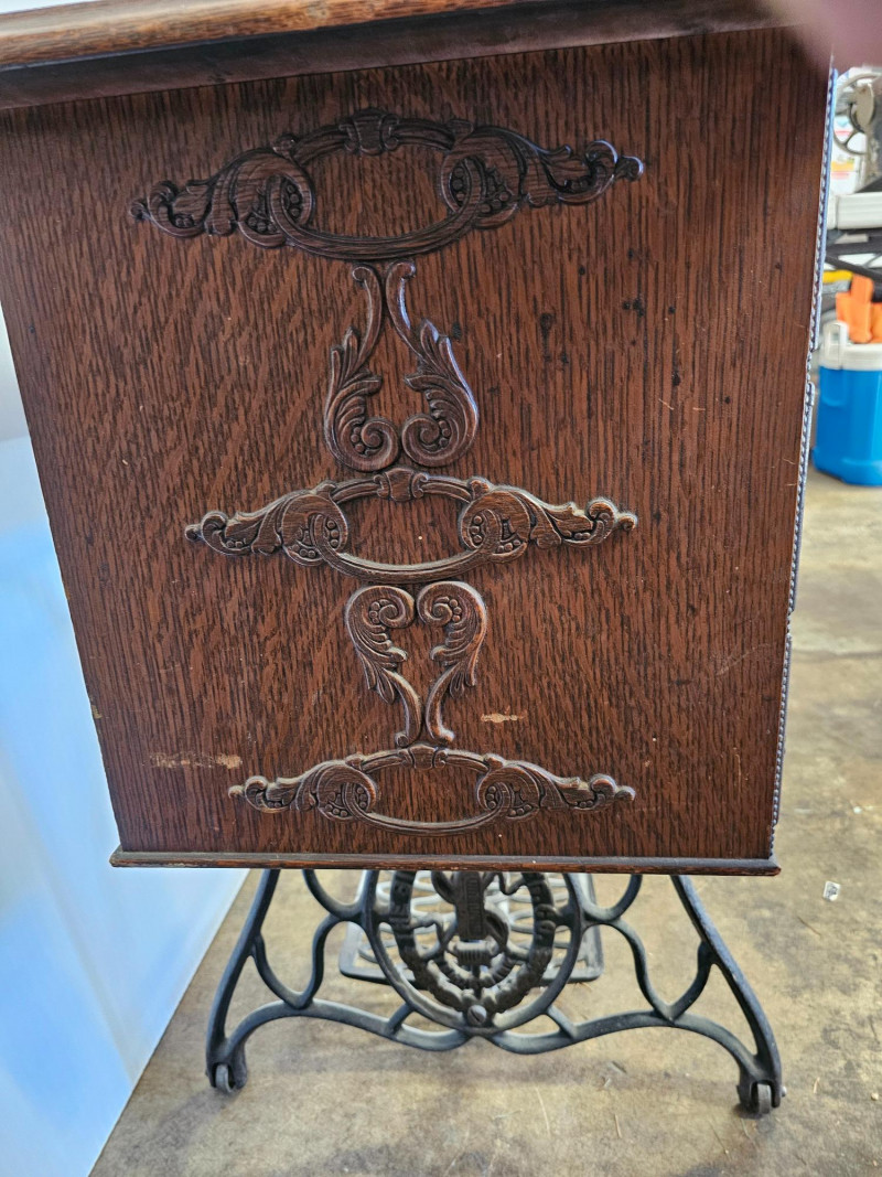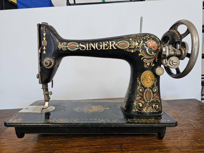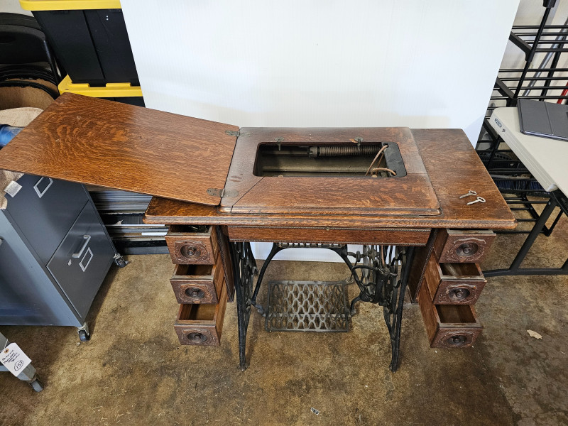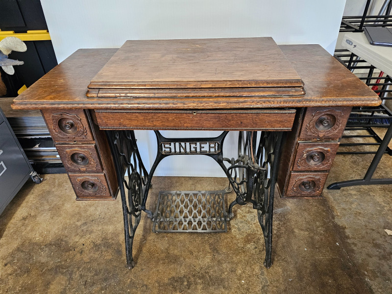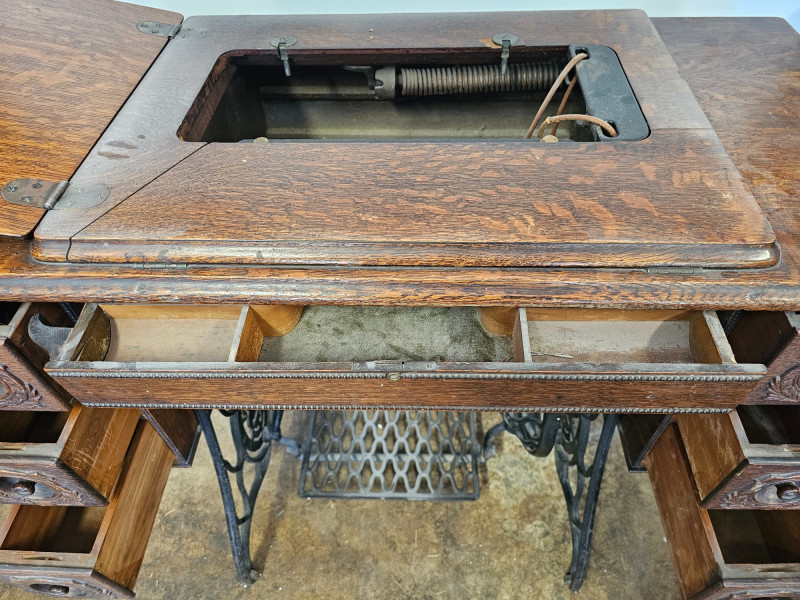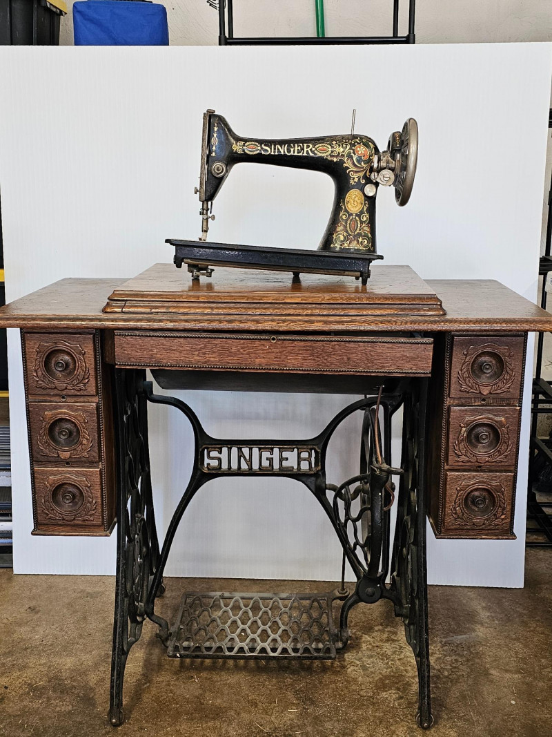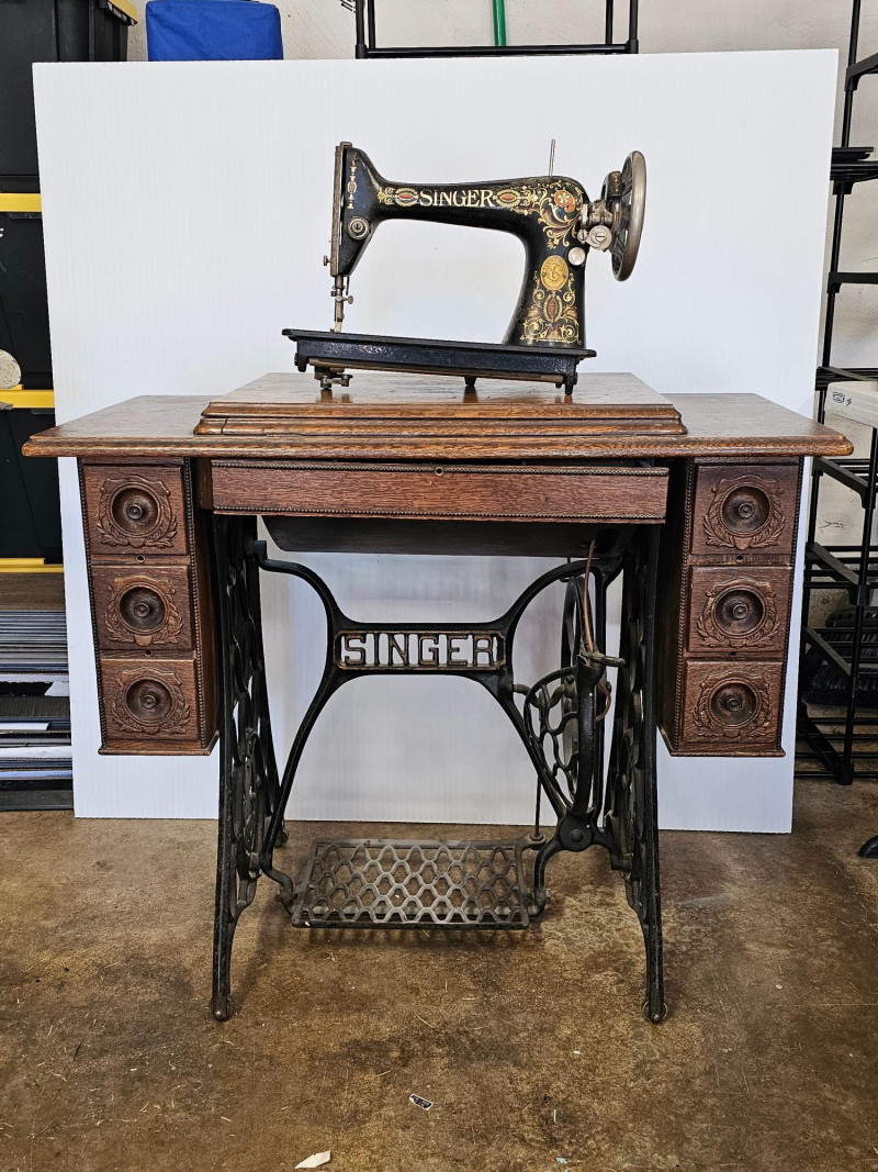 Antique Singer 66 "Red Eye" Treadle Sewing Machine With Cabinet Early 1900s Singer 66 "Red Eye" The "Red Eye" in a Singer Treadle sewing machine refers to a specific style of decorative decals found on the Singer 66 model, not a separate model itself. These decals, characterized by a distinctive red and gold eye design, were primarily used on the Singer 66 class machines during the early 20th century Singer treadle sewing machines were particularly popular during the late 19th and early 20th centuries. These machines were powered by a foot-operated treadle, offering a convenient and efficient alternative to hand sewing. The ornate detailing and sturdy construction of these machines made them not only functional tools but also beautiful pieces of furniture, often passed down through generations. Original cabinet has 3 vertical drawers on either side, with one shallow drawer in the middle. 2 keys included in middle drawer. Treadle mechanism moves freely, but I have no idea how the sewing machine connects to the cabinet Singer 66: 12"T x 16"W x 7"D Cabinet: 30.5"T x 36.5"W x 18"D Untested!