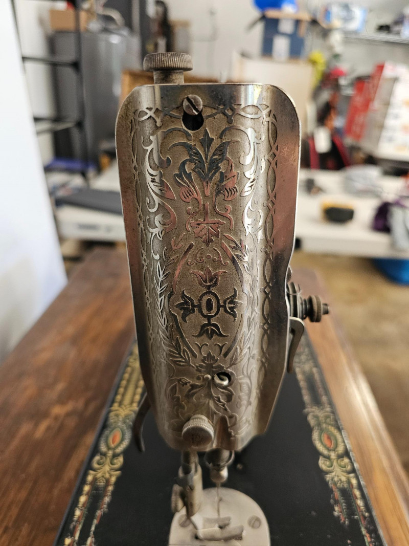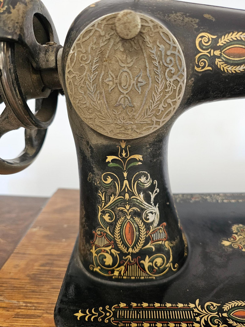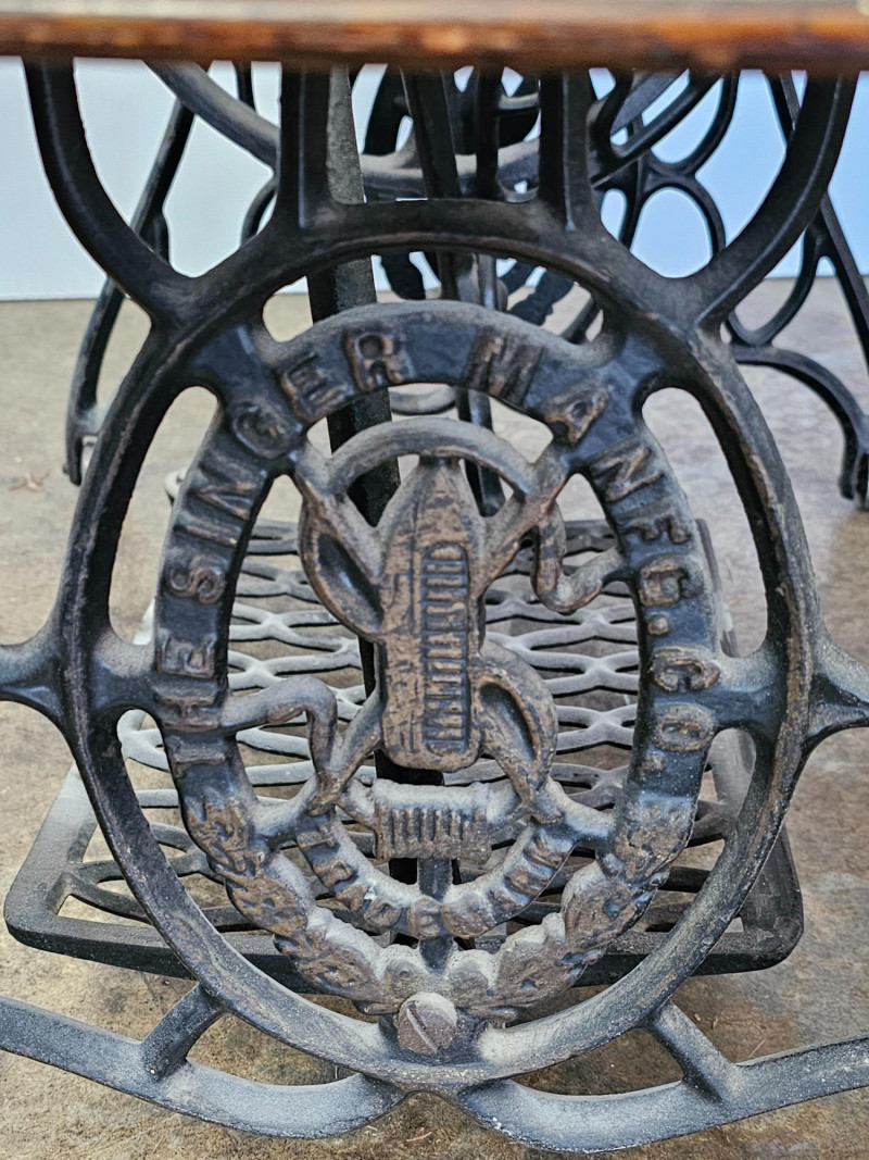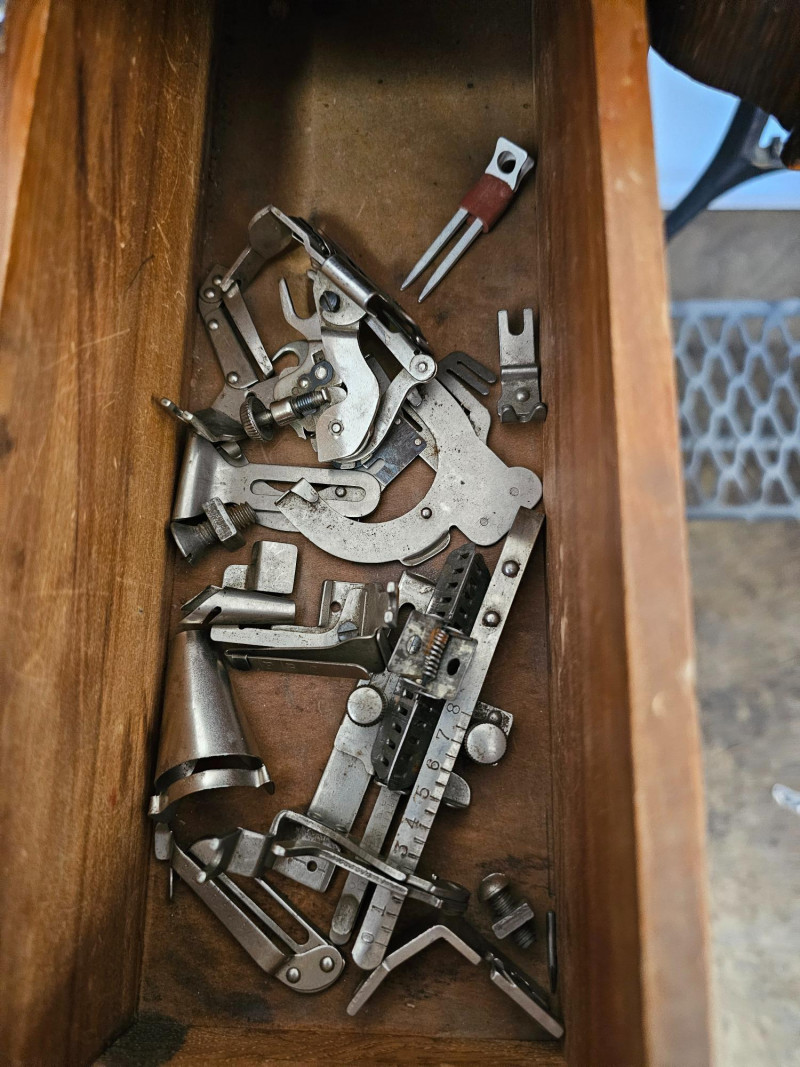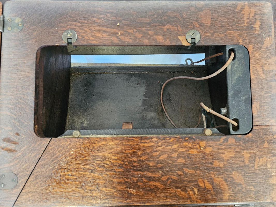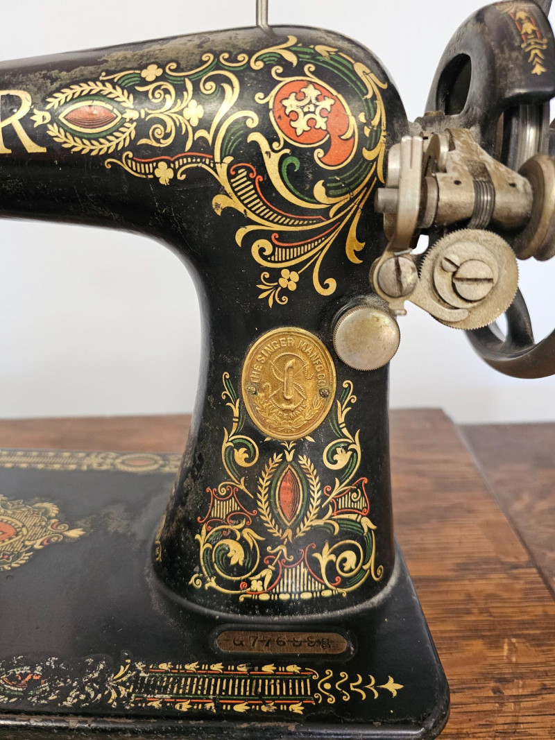 Antique Singer 66 "Red Eye" Treadle Sewing Machine With Cabinet Early 1900s Singer 66 "Red Eye" The "Red Eye" in a Singer Treadle sewing machine refers to a specific style of decorative decals found on the Singer 66 model, not a separate model itself. These decals, characterized by a distinctive red and gold eye design, were primarily used on the Singer 66 class machines during the early 20th century Singer treadle sewing machines were particularly popular during the late 19th and early 20th centuries. These machines were powered by a foot-operated treadle, offering a convenient and efficient alternative to hand sewing. The ornate detailing and sturdy construction of these machines made them not only functional tools but also beautiful pieces of furniture, often passed down through generations. Original cabinet has 3 vertical drawers on either side, with one shallow drawer in the middle. 2 keys included in middle drawer. Treadle mechanism moves freely, but I have no idea how the sewing machine connects to the cabinet Singer 66: 12"T x 16"W x 7"D Cabinet: 30.5"T x 36.5"W x 18"D Untested!