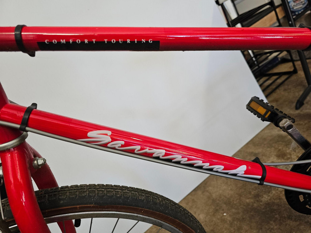 Huffy Savannah Comfort Touring Bike Huffy Savannah is a comfort/commuter road bike Duralite High Strength Steel Frame 10-speed thumb shifters Kickstand Tires need inflated or possibly new tubes Some rust on handlebars, pedal arms, wheels Appears to be in good used shape (see pics) Untested!