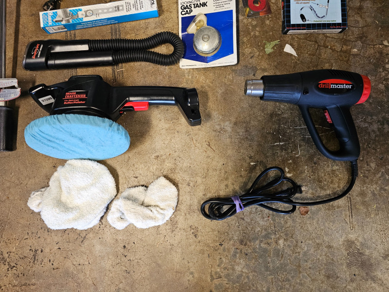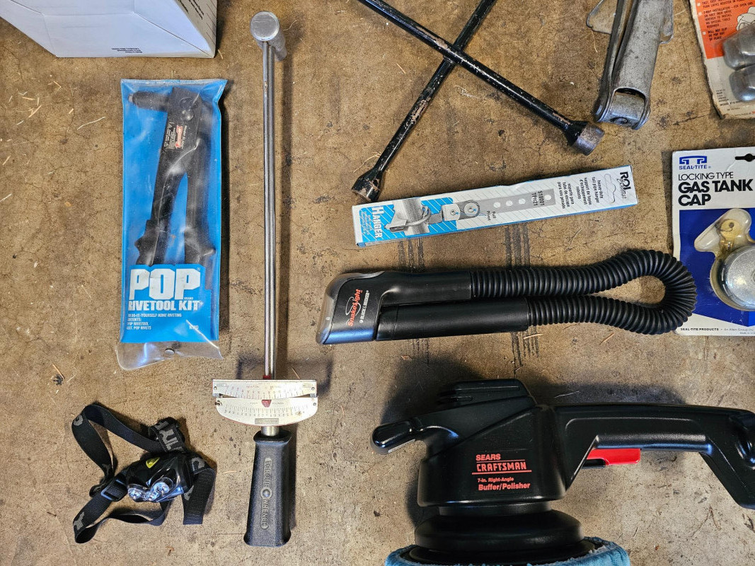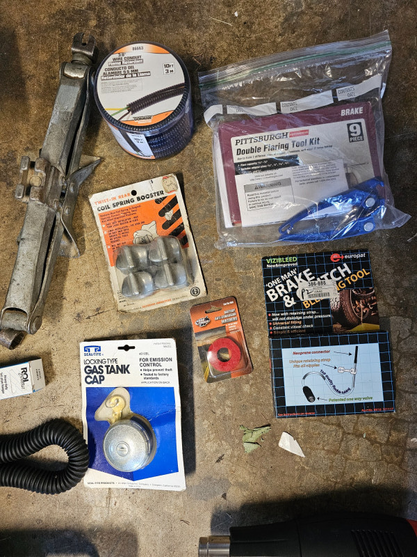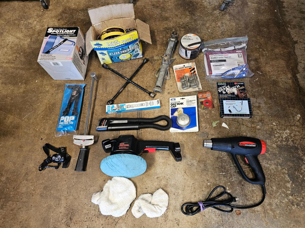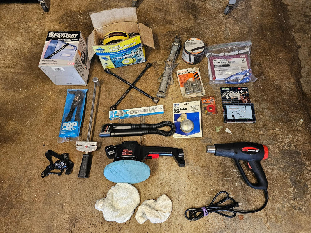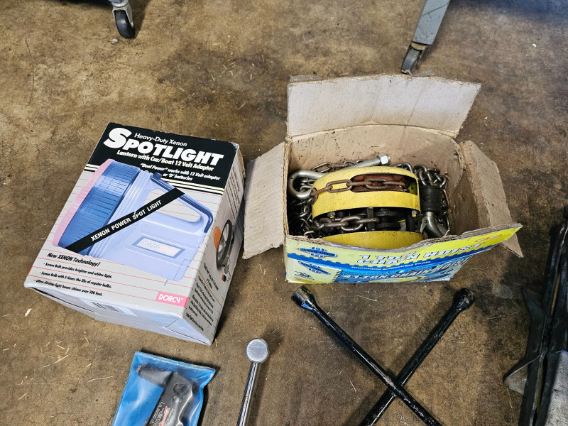(17) Miscellaneous Automotive Tools 1-ton chain hoist Near new Craftsman 7" electric buffer/polisher Drill Master heat gun Spare tire scissor jack New 10ft roll of split loom tubing for automotive wires Pittsburgh double flaring tool kit Tire iron New coil spring booster New brake & clutch bleeding tool New locking gas cap New exhaust pipes hanger Pop rivetool kit Craftsman torque wrench HD xenon 12v spotlight LED headlamp