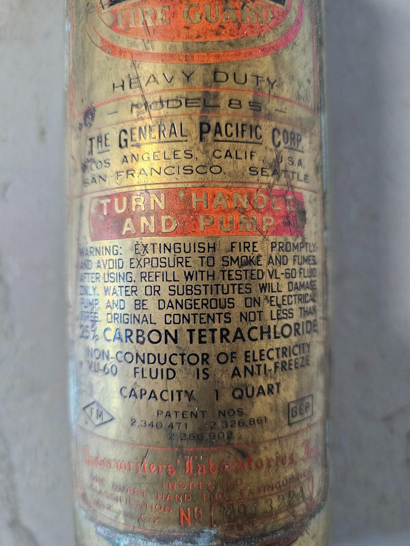 Vintage Quick Aid Model 85 Brass Fire Extinguisher Made by The General Pacific Corp Produced during the mid-20th century, these extinguishers were designed for home and automotive use The Model 85 was a popular variant known for its heavy-duty construction and effectiveness on various types of fires These extinguishers used carbon tetrachloride as the extinguishing agent, which was a common practice at the time Includes hanging bracket 14"T x 3"W x 3.5"D Untested!