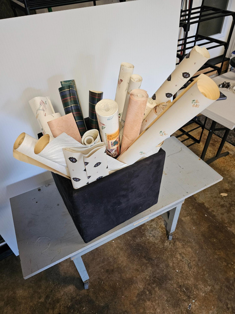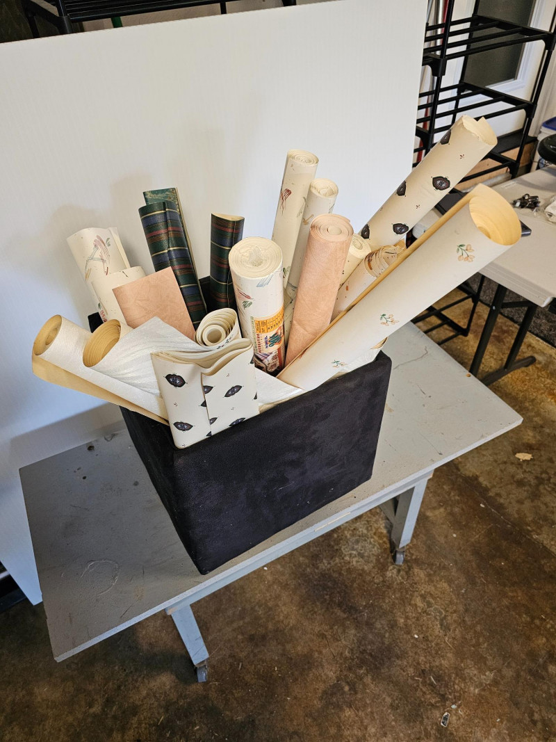 Box Of 20+ Rolls Of Vintage Wallpaper (Some New) 20" - 27" wide rolls, some new in package A few rolls of wallpaper borders as well