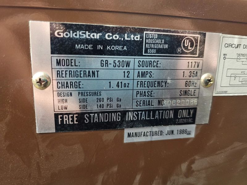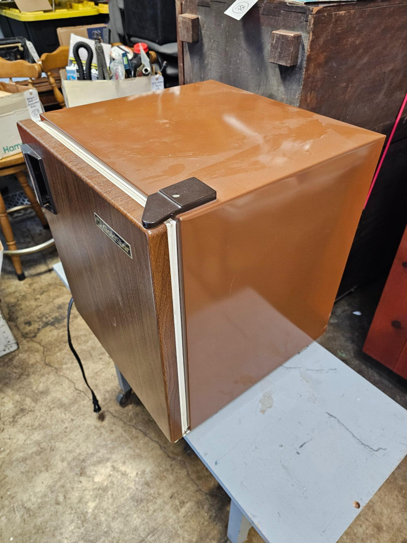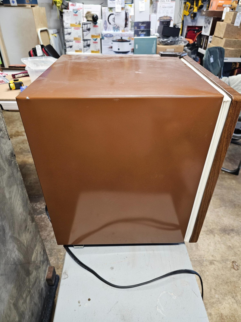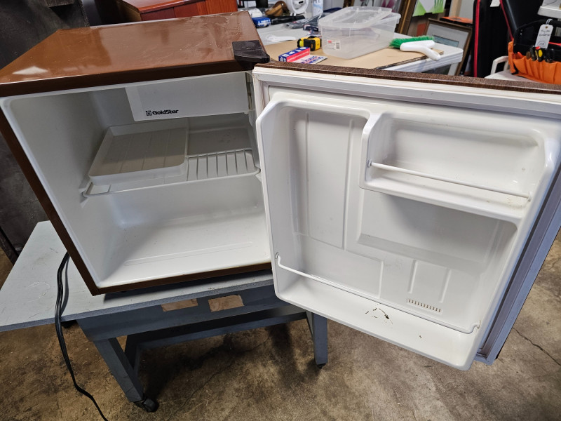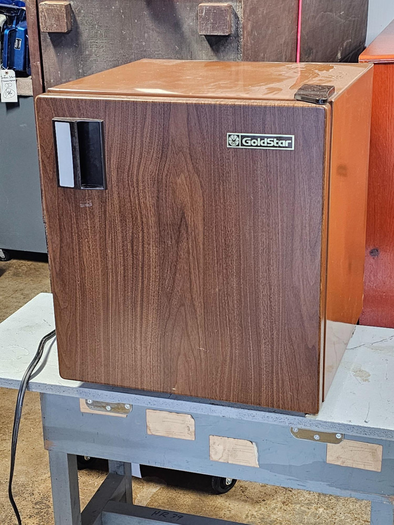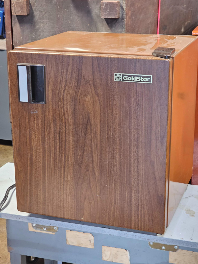Goldstar Mini Bar Refrigerator Model #GR-530W Vintage wood grain door Tested - Works! 20"T x 17"W x 17"D
