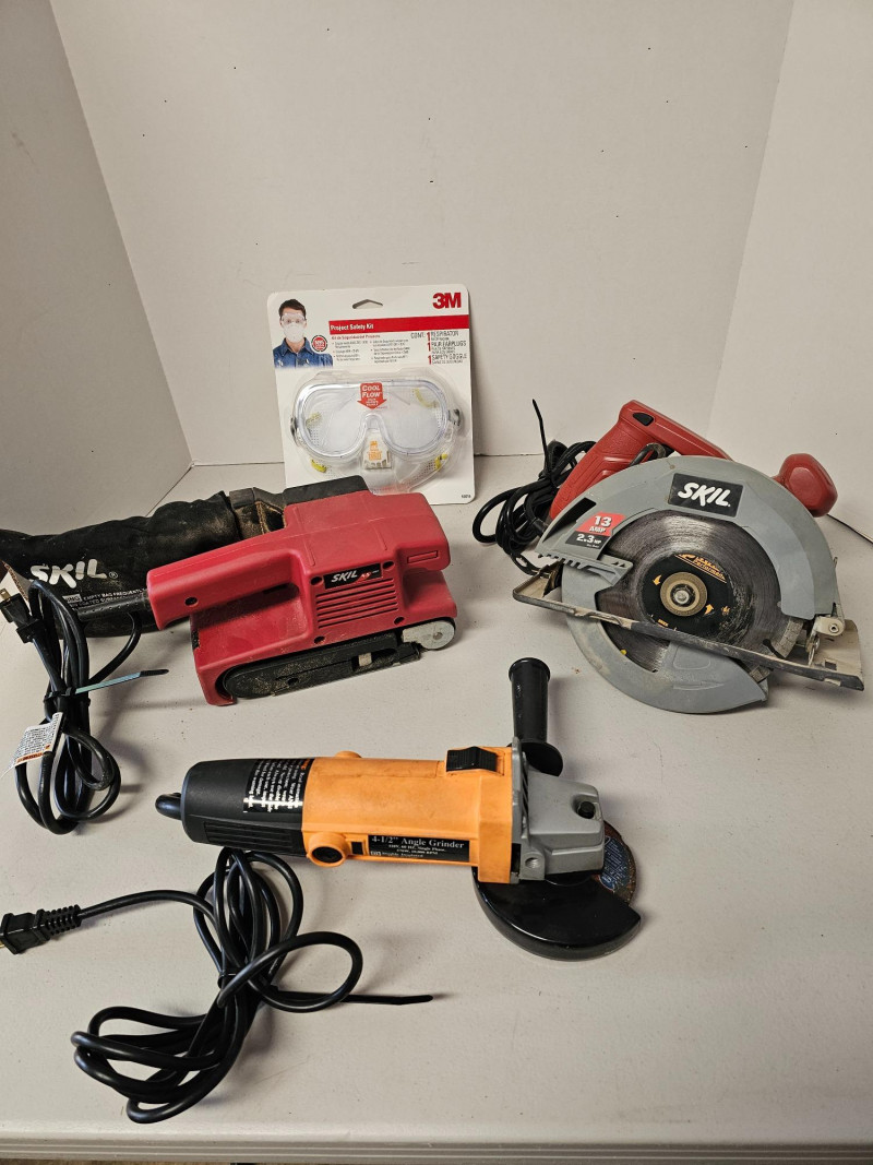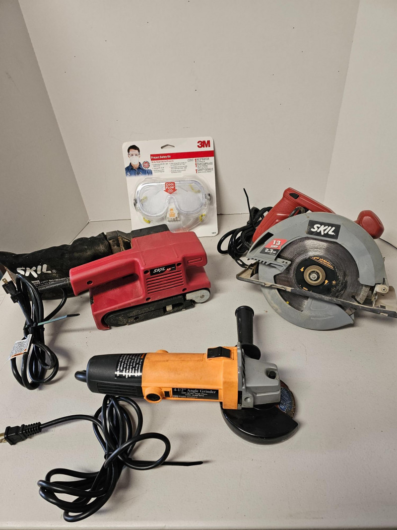 Corded Power Tool Lot & Safety Kit (1) Skil 7.25" Circular Saw - #5080 13amp 2.3hp (1) Skil 3" x18" Belt Sander - #7313 4.5amp (1) Chicago Electric 4.5" Angle Grinder - #42204 Includes 3M Project Safety Kit - safety goggle, respirator & pair of earplugs All Tested - All Work!