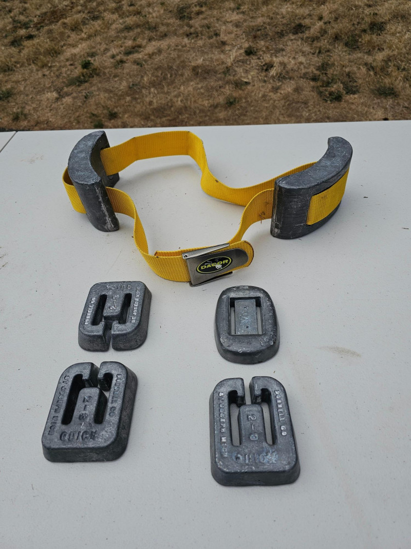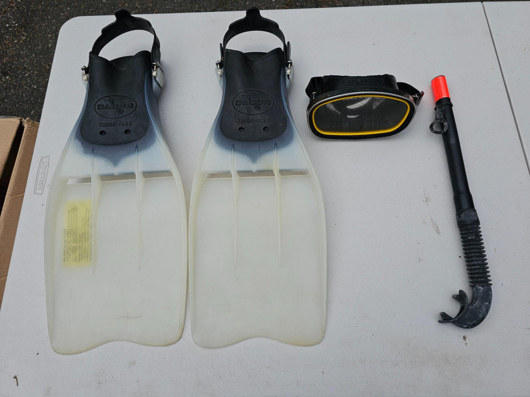 Snorkel & Scuba Gear (1) Pair of Dacor Turbo-Flex scuba fins (1) U.S. Divers Atlantis mask (1) Dacor Glow-Top snorkel (1) Dacor scuba diving weight belt with stainless steel buckle (2) Large lead weights (4) Smaller lead weights
