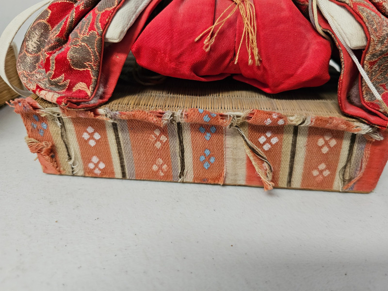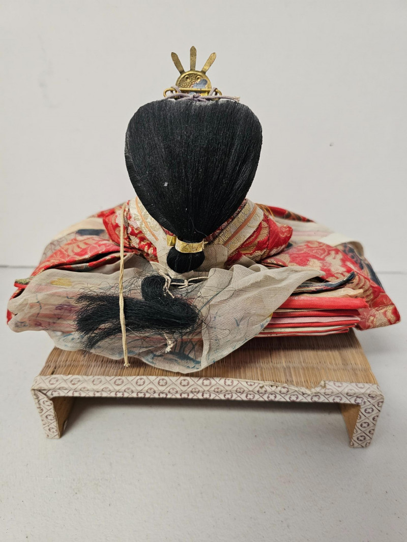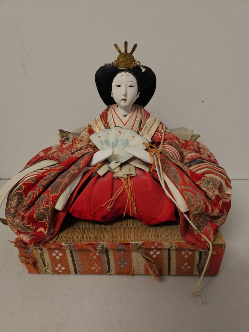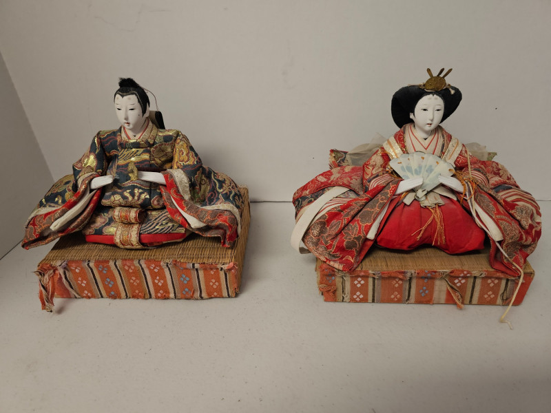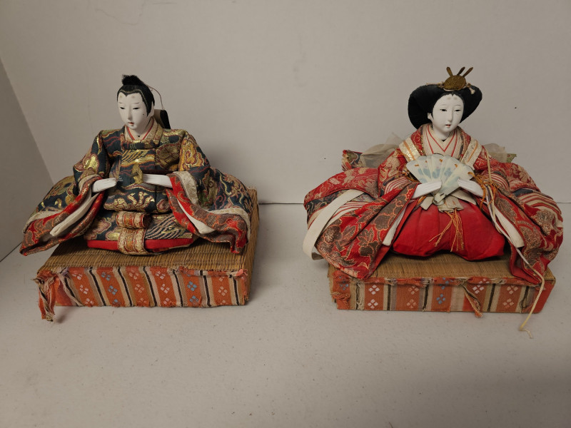 Pair Of Traditional Japanese Hina Dolls (Hina-ningyo) These display dolls are a central part of the Hinamatsuri (Doll's Day or Girl's Day) festival in Japan The dolls, often arranged in a tiered display (Hinakazari), represent the Emperor and Empress, symbolizing prosperity and good fortune The tradition dates back to the Edo period and is rooted in earlier purification rituals from the Heian period, where dolls were used to ward off bad luck The dolls appear to be in good used condition (see pics). Some fabric fraying on the tier displays that the doll sit atop. Each dolls approximately 7.5"T x 7.5"W x 4"D Wood storage box included!