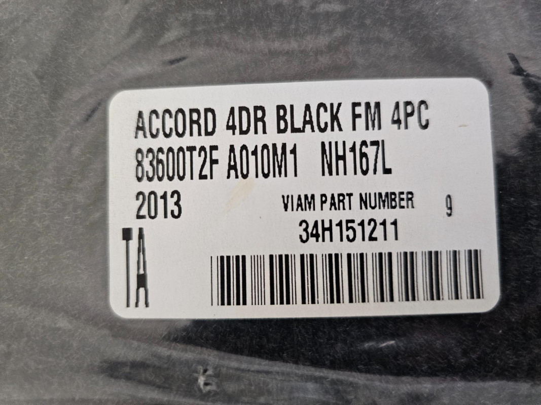 Factory Sealed 2013 Honda Accord 4DR Black OEM Carpeted Floor Mats Complete set of OEM black carpeted floor mats for a 2013 4-door Honda Accord Part Number: 83600T2F A010M1 (superseded by 83600-T2F-A02ZA) Color Code: NH167L (Graphite Black). Unopened!