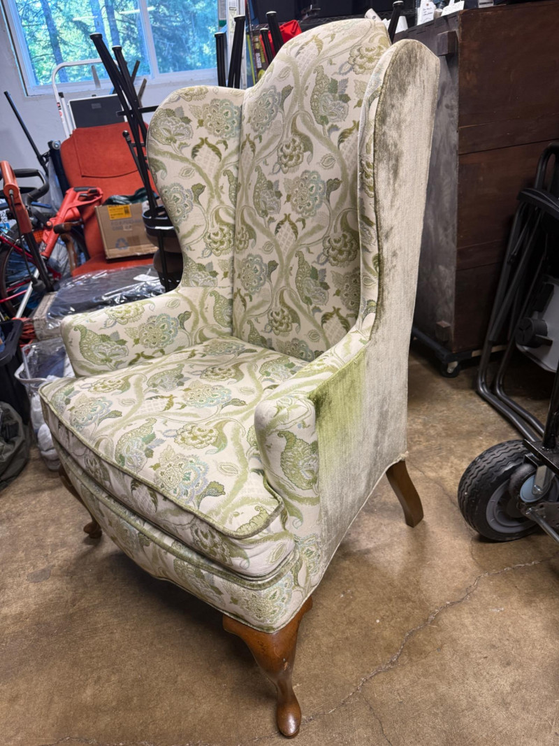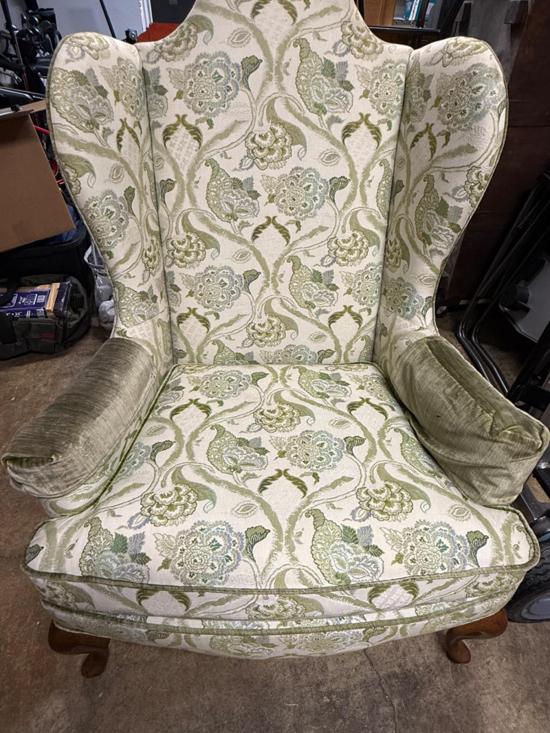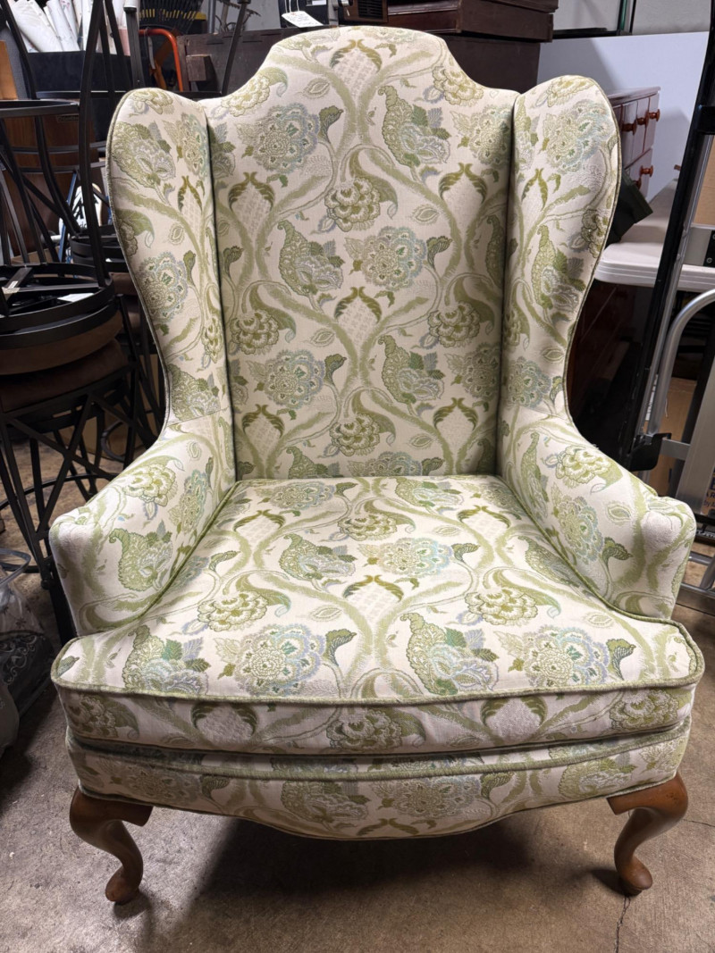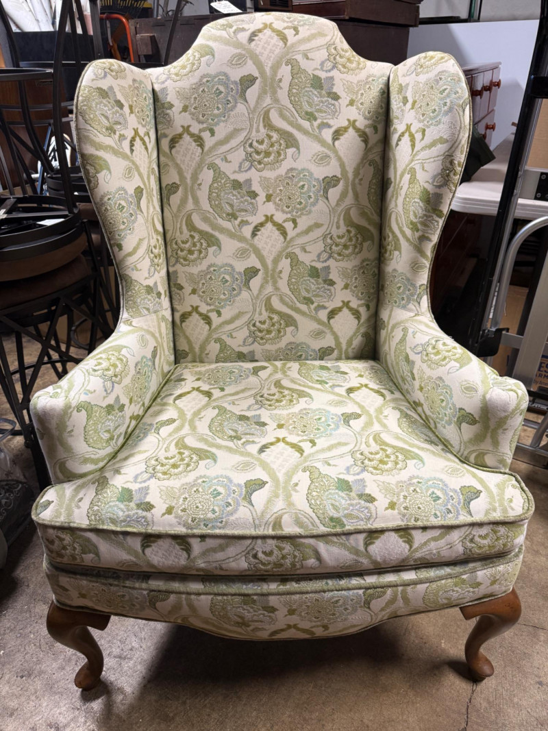 1977 Drexel Heritage Queen Anne Style Wingback Chair Features a distinct wingback design, cabriole legs, and upholstery with a floral pattern in green and white Solid wood frame Chair is in good used condition (see pics) Includes set of armrest covers 44.5"T x 31"W x 30"D