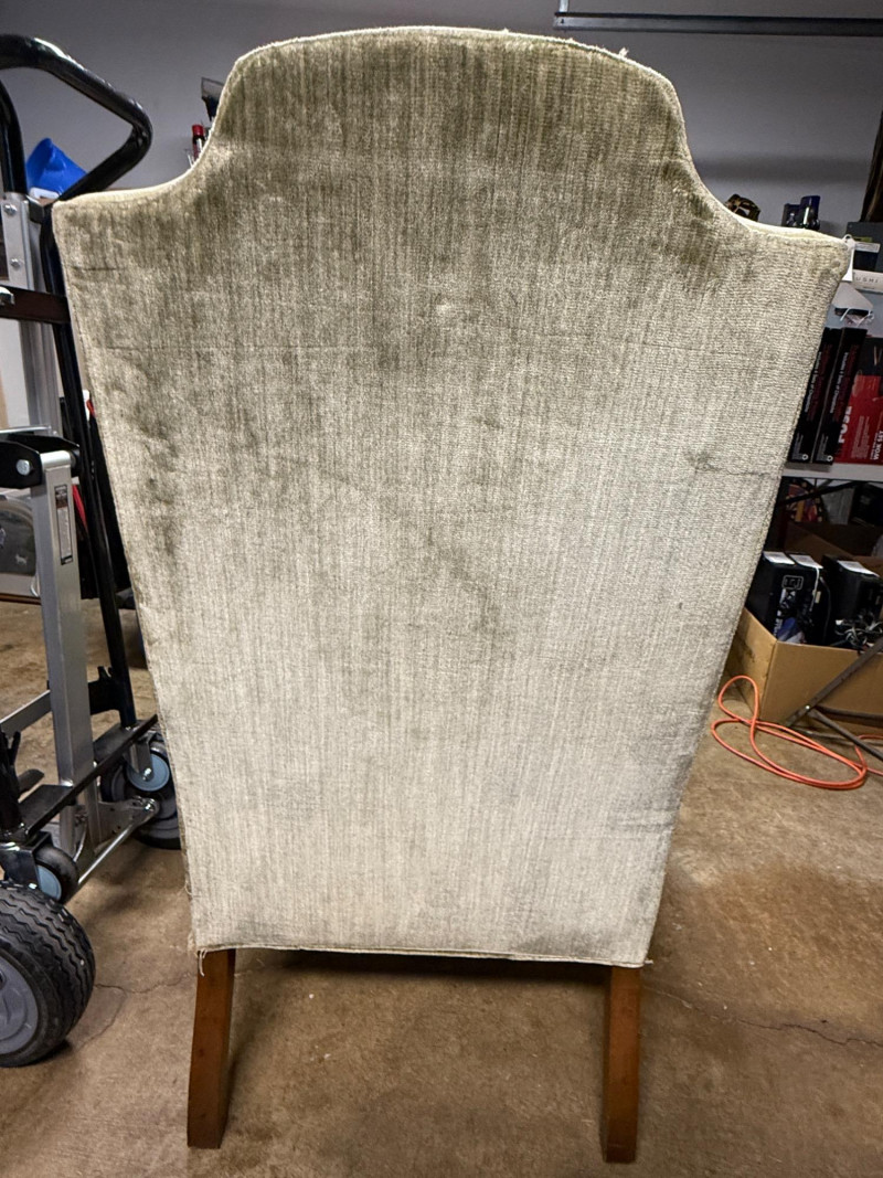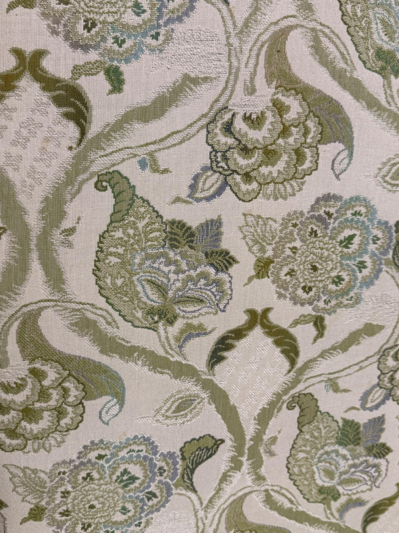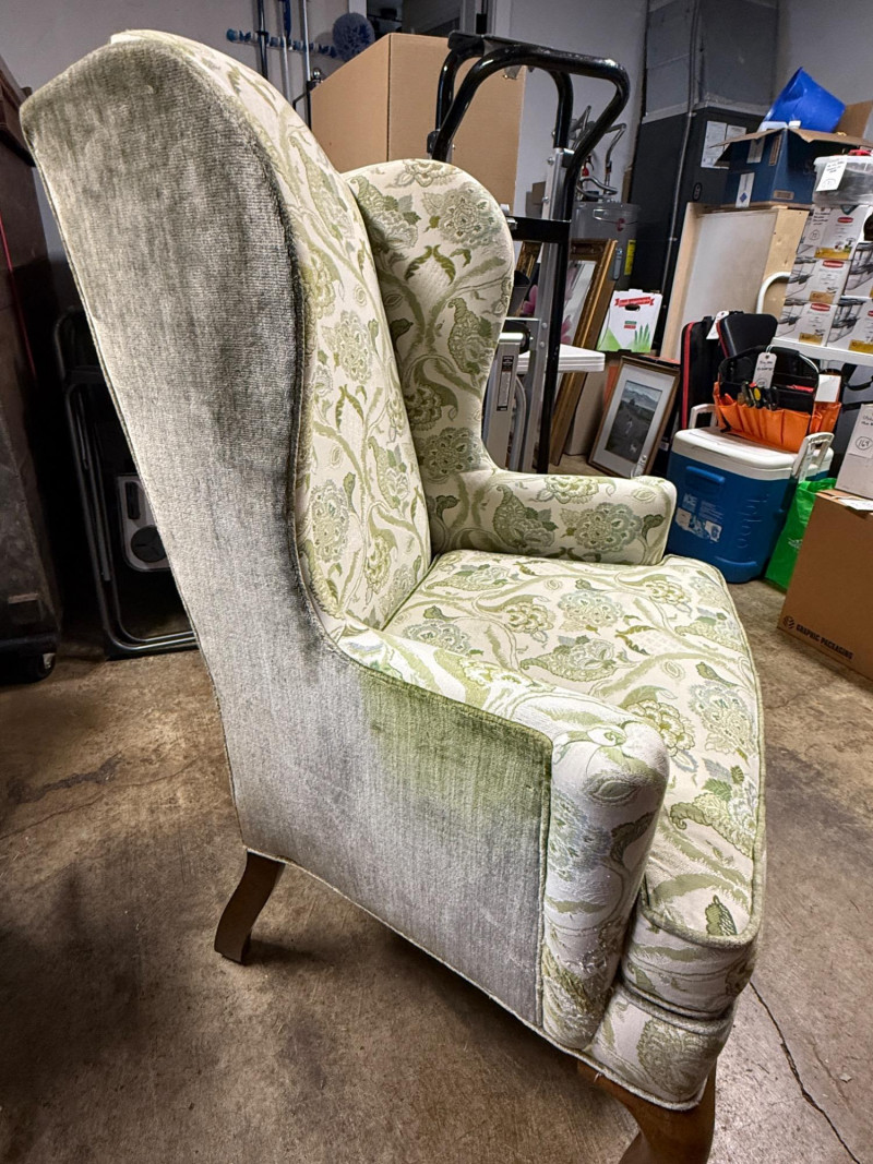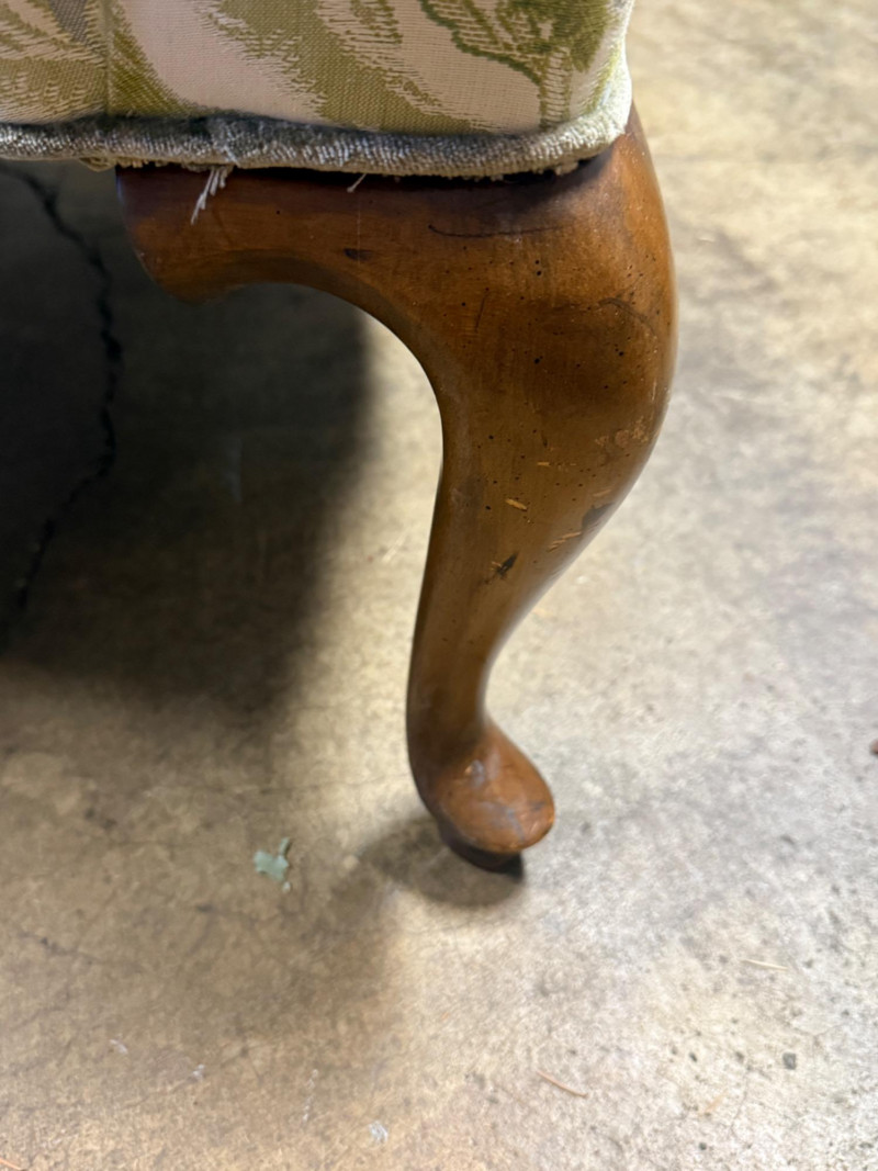 1977 Drexel Heritage Queen Anne Style Wingback Chair Features a distinct wingback design, cabriole legs, and upholstery with a floral pattern in green and white Solid wood frame Chair is in good used condition (see pics) Includes set of armrest covers 44.5"T x 31"W x 30"D
