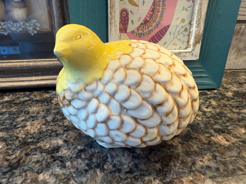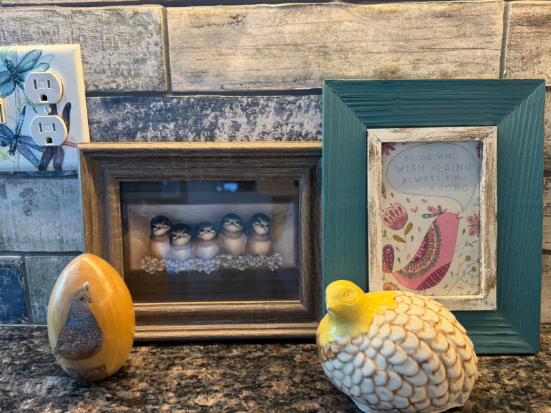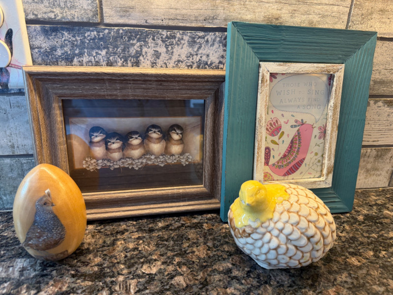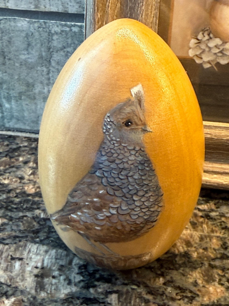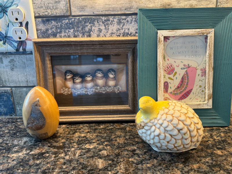 Ceramic quail 5”x4” Handpainted quail wood egg Framed Chickadees Inspirational bird