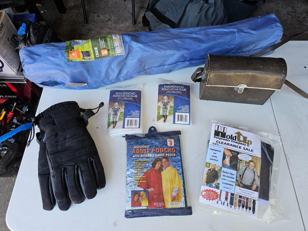 Lot # 257 - Camp Chair, Binoculars, Ponchos, Gloves & Suspenders
