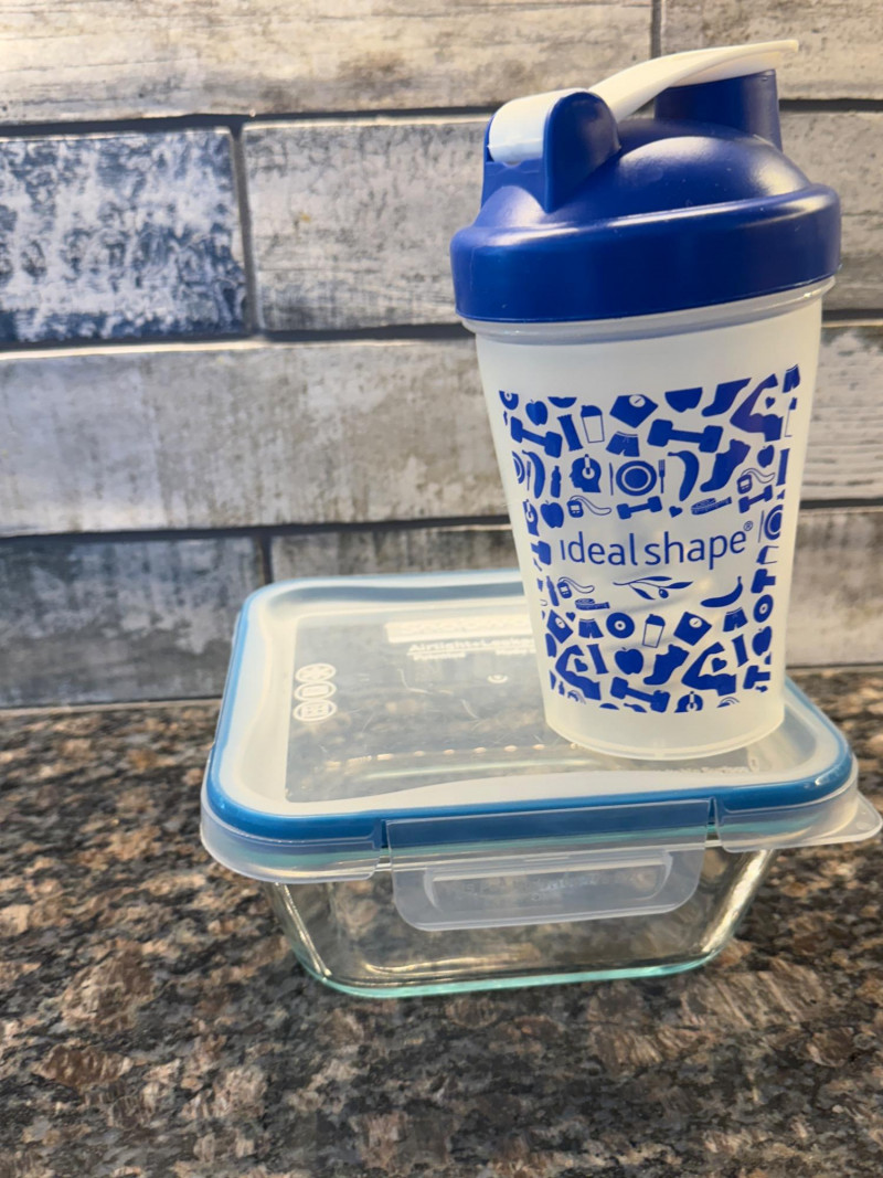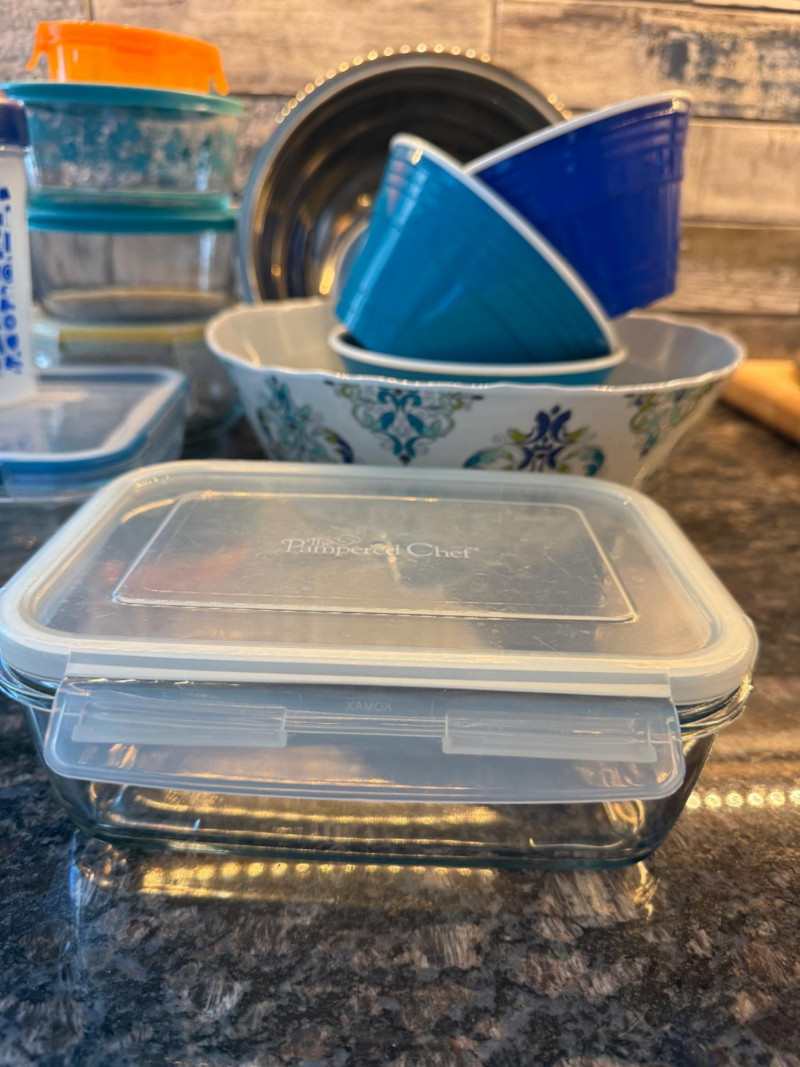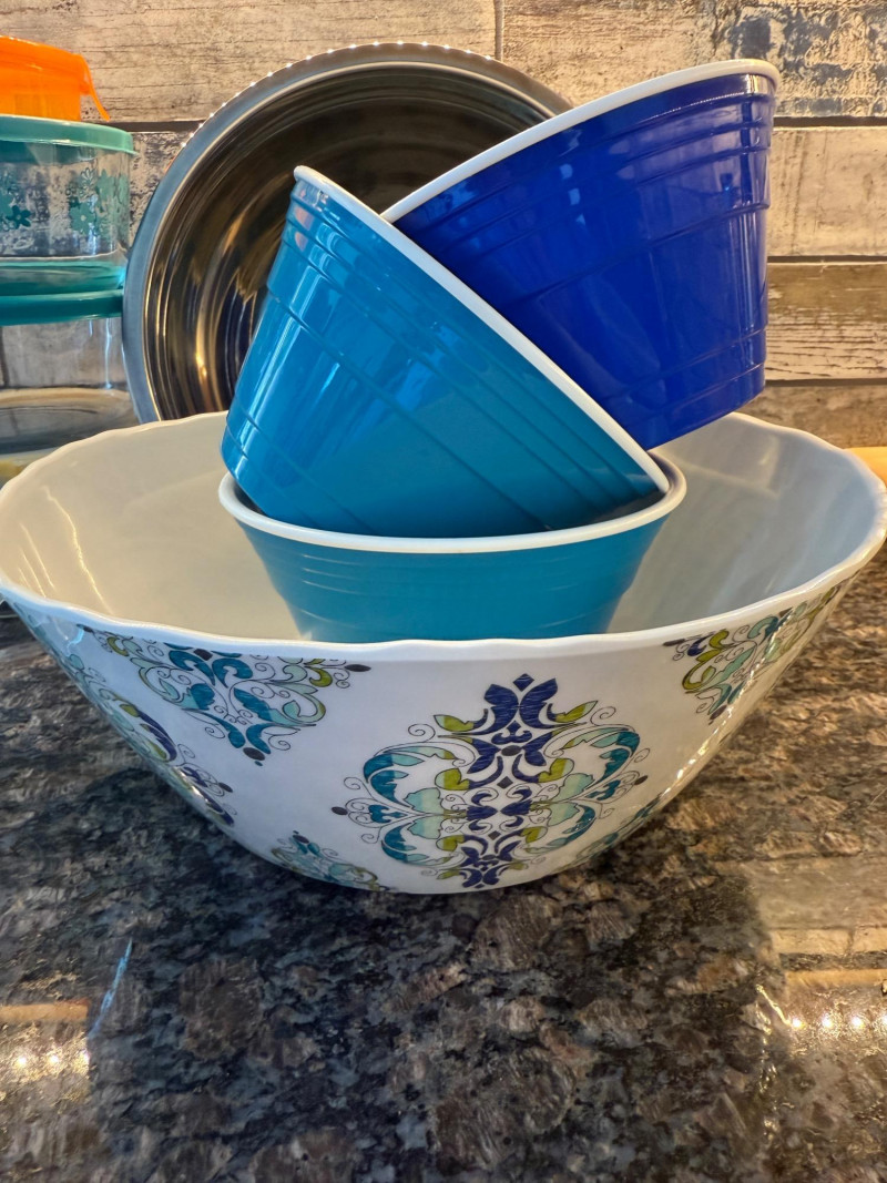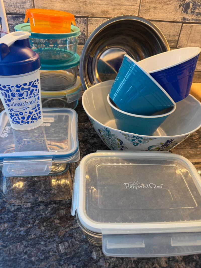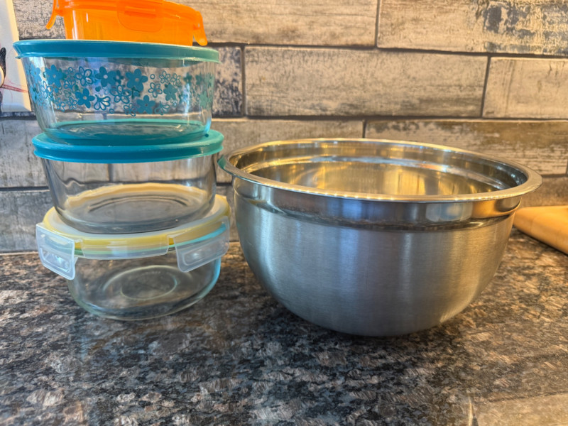 Glass storage containers, stainless mixing bowl, melamine salad bowl and blue bowls. Drink shake mixer.