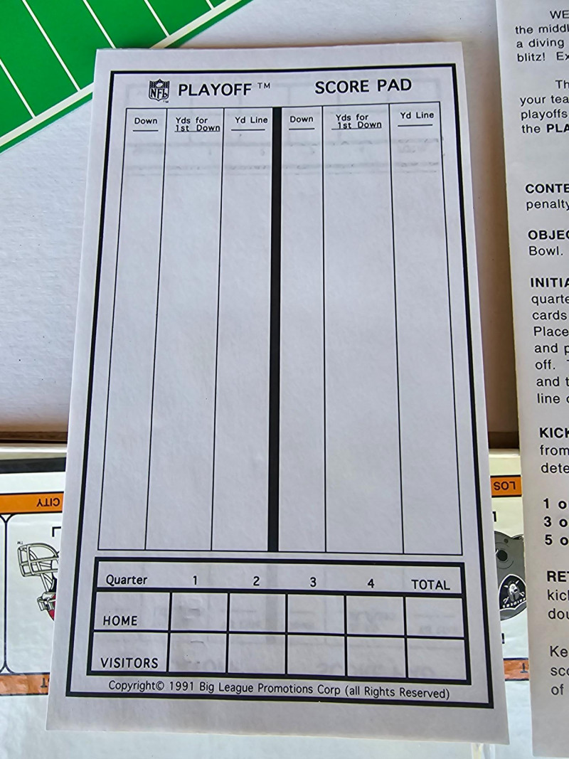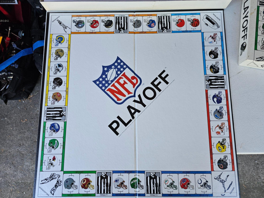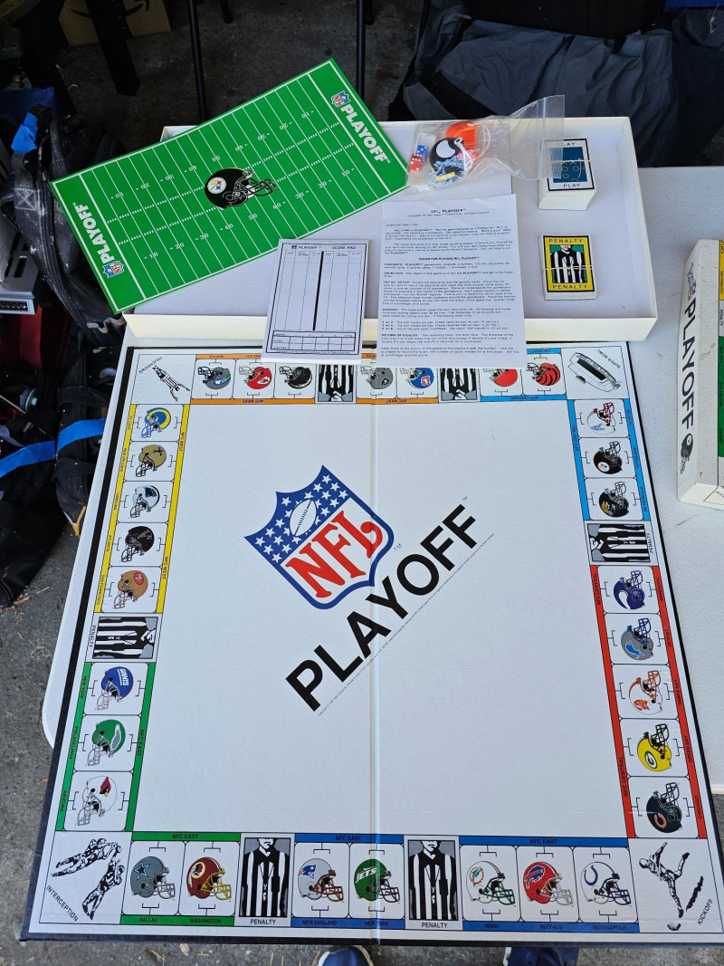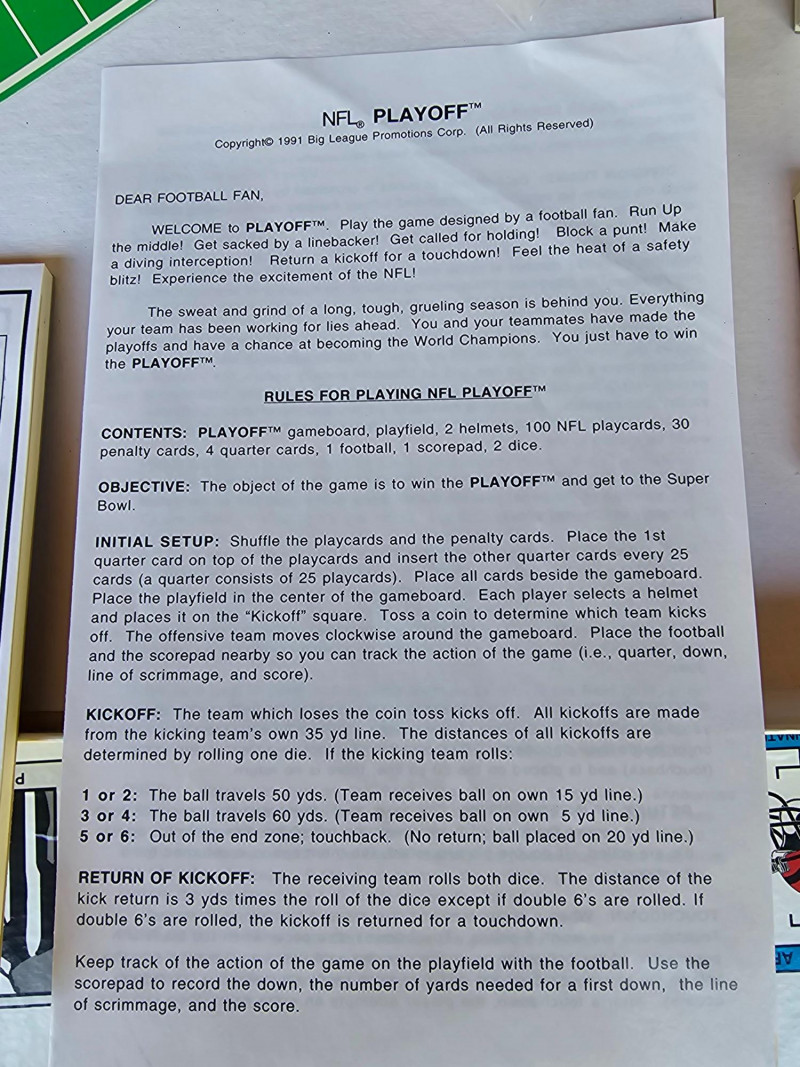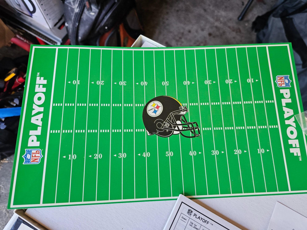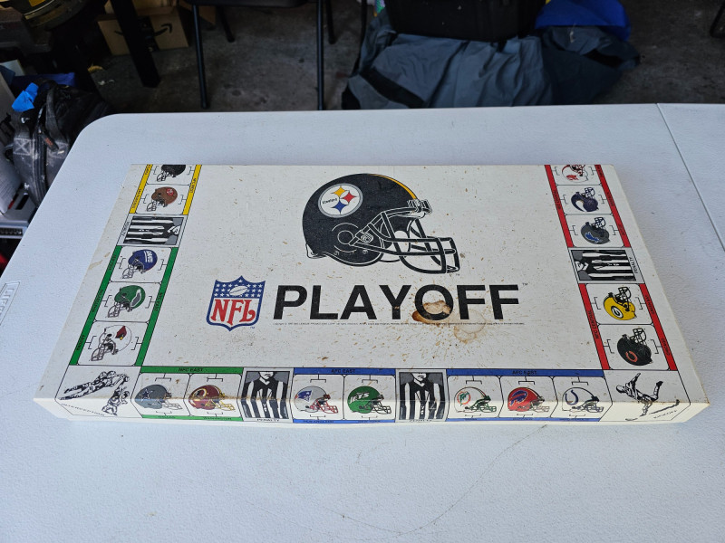 1991 NFL Playoff Board Game Similar to Monopoly, but NFL Teams instead of properties Featuring the Pittsburgh Steelers & Cleveland Browns Appears complete: includes original box, instructions, score pad, Steelers & Brown mini helmets, 2 dice, set of Play cards, set of penalty cards, and paper Steelers football field Outer box is a bit dirty, but everything else appears in great condition!