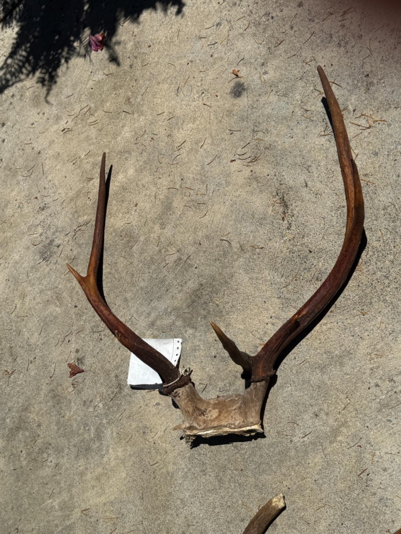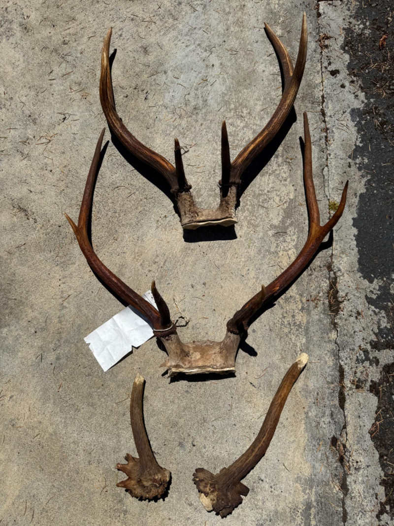 Elk Antler Racks & Knarley Naturally Shed Antlers 19.5”x24” tip to tip and skull to tip 16”x22.5” 2 knarley antlers may have been chewed on the tips 14.5” & 9.5”